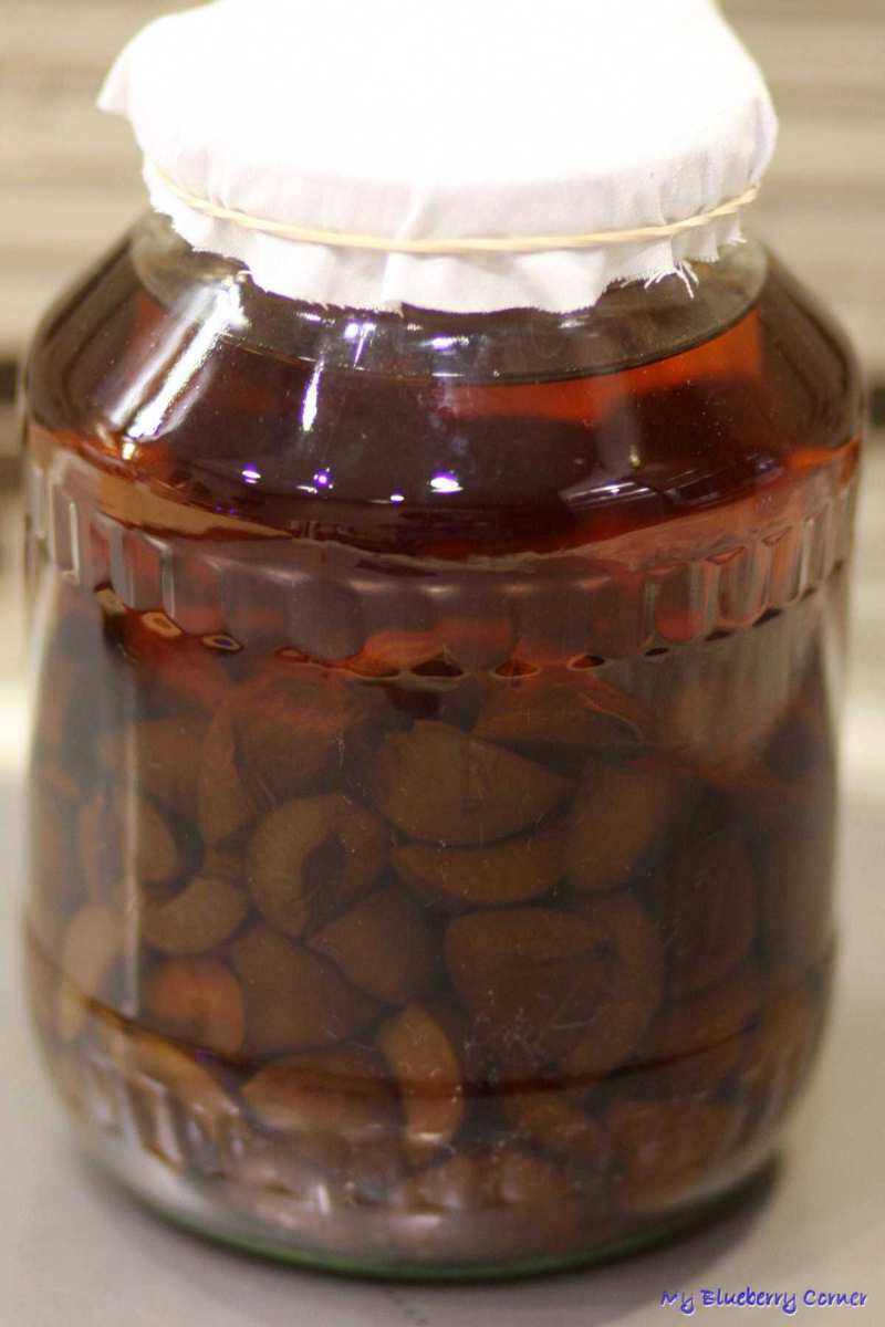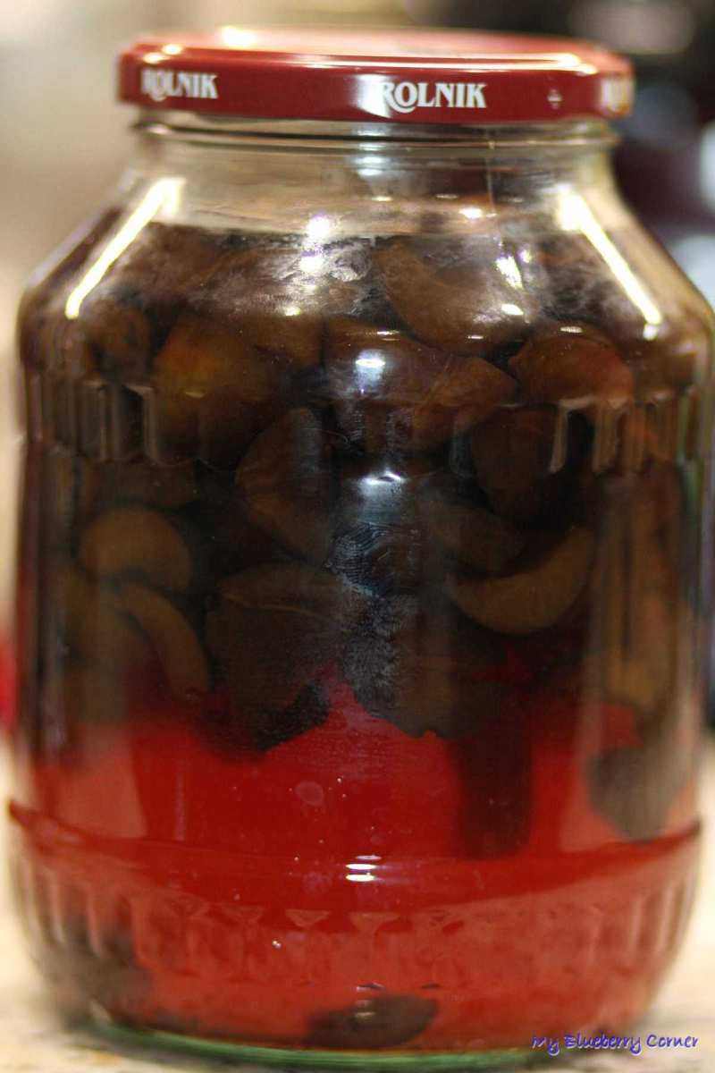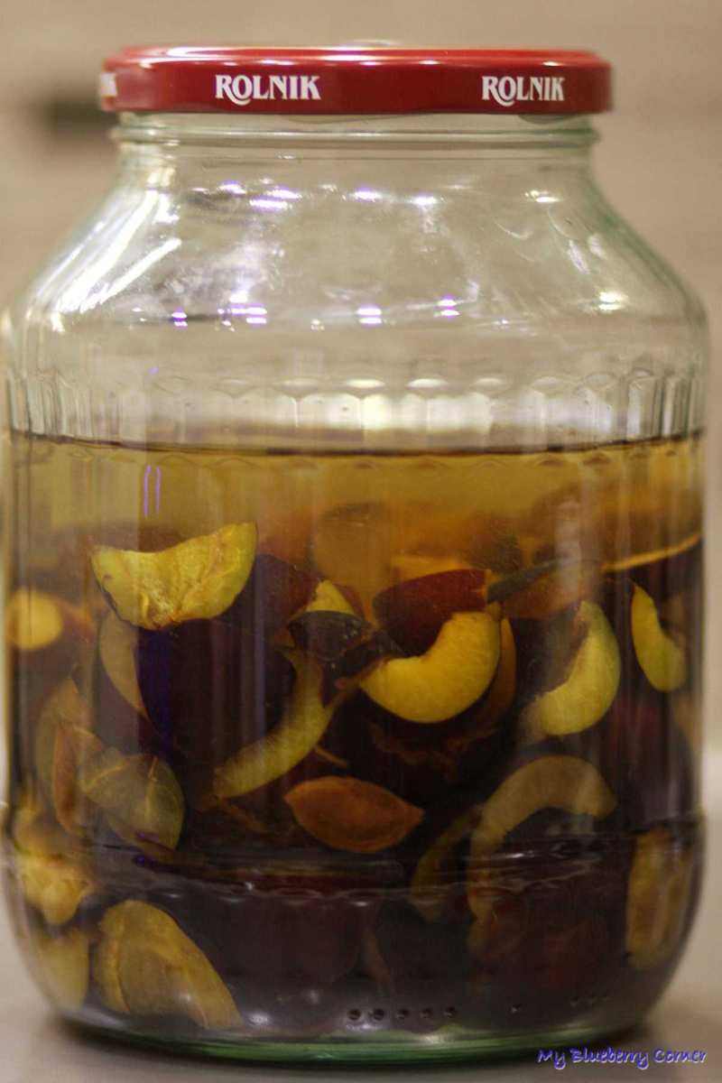 Odstawić na 4 tygodnie, co drugi dzień wstrząsać. Po tym czasie do słoja z owocami dodać syrop przygotowany z cukru i drugiej porcji wody.