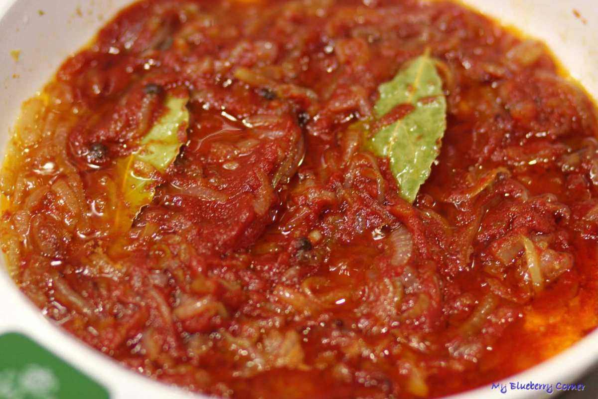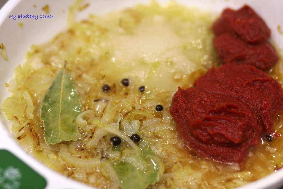 Olej rozgrzać na patelni, dodać cebulę i podsmażyć. Po chwili dodać cukier, ocet, liście laurowe, ziele i koncentrat.