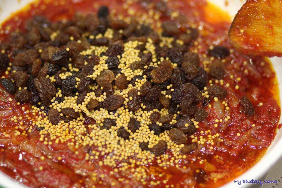 Przyprawić solą i pieprzem, dodać gorczycę i rodzynki.