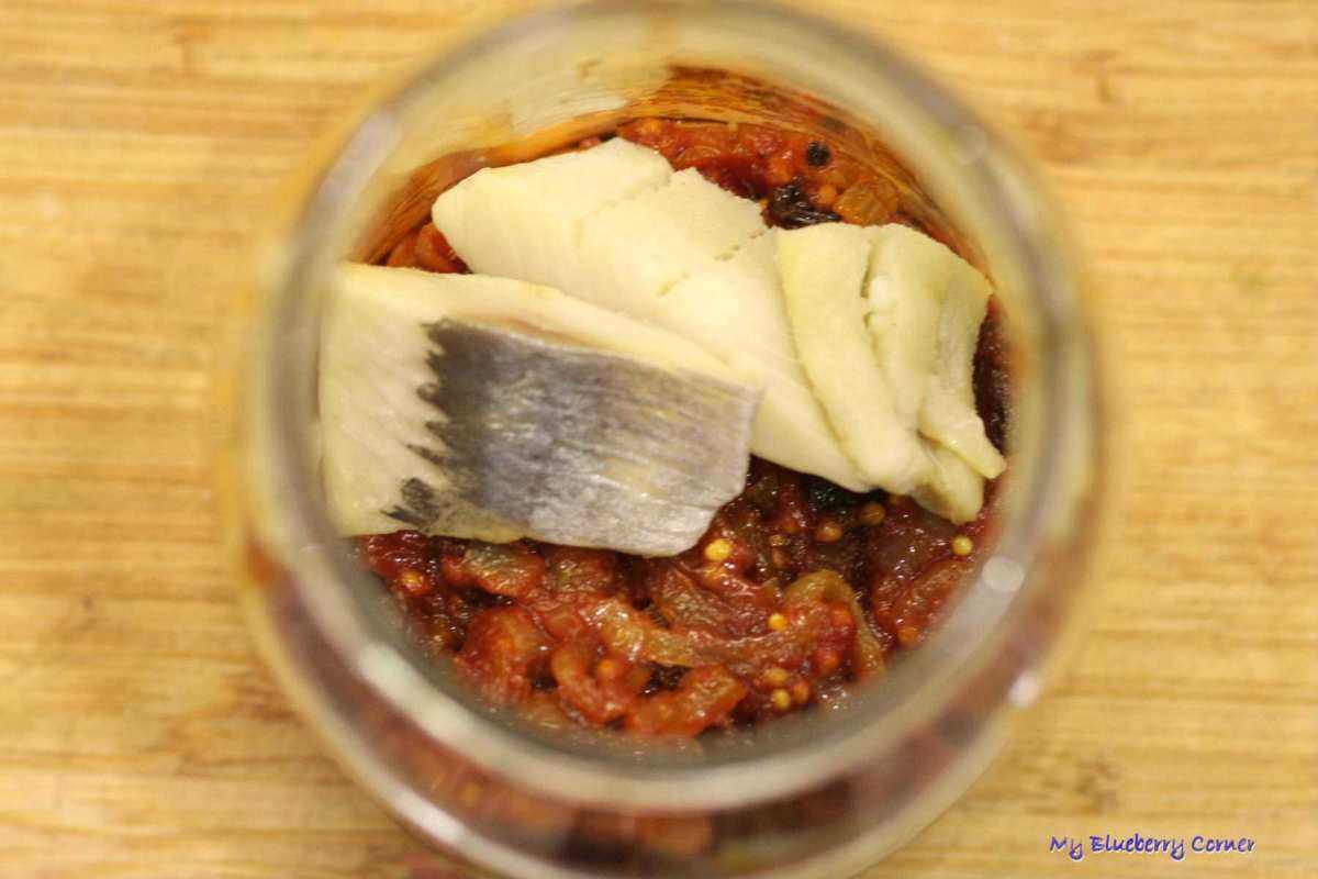 Układać w słoiku warstwami śledzie na zmianę z marynatą.