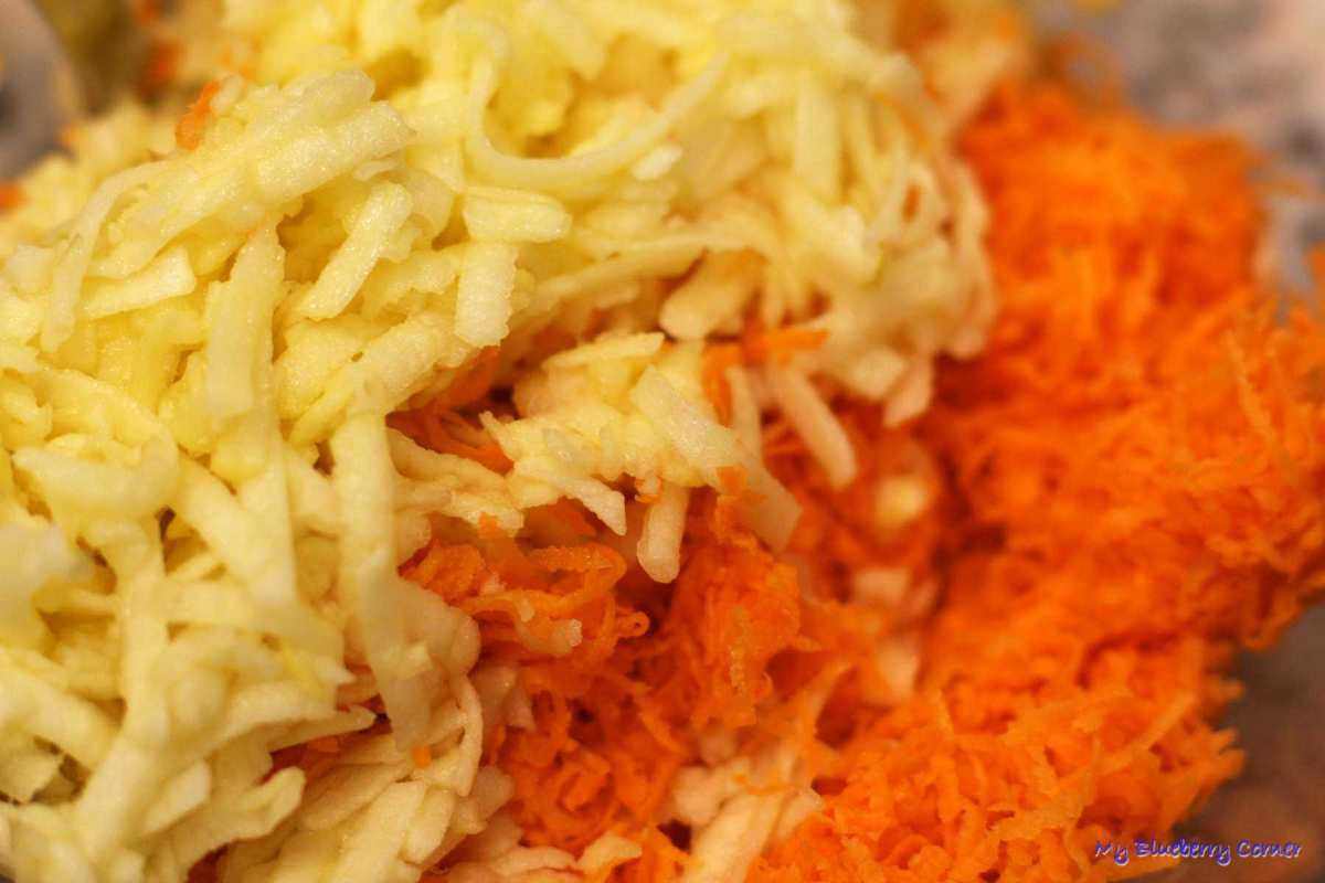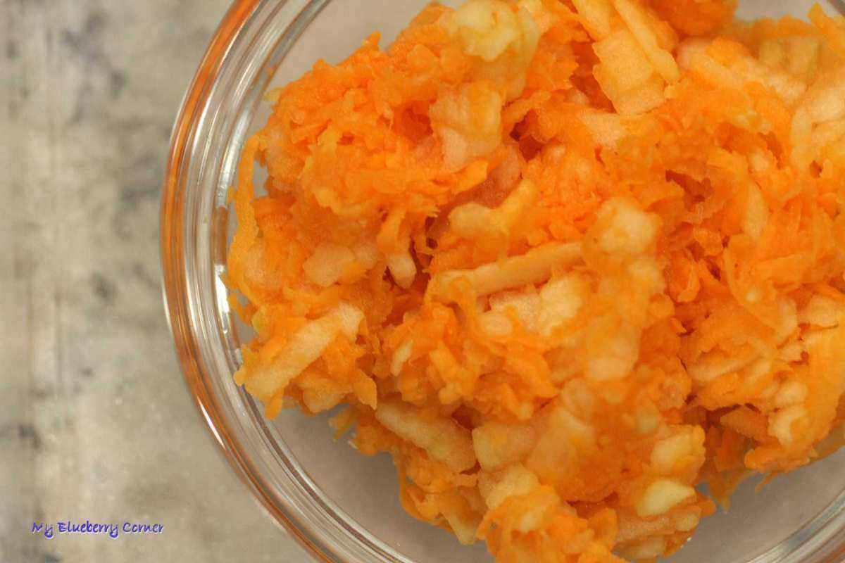 Marchewki i jabłka obrać, z jabłek usunąć gniazda nasienne. Najpierw zetrzeć marchewki na tarce drobnych oczkach, następnie jabłka na grubych oczkach.