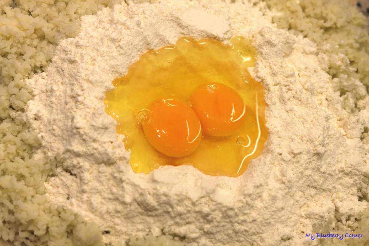 Ziemniaki wyłożyć na stolnicę lub kamienny blat, na to wysypać mąkę (ilość mąki zależy od rodzaju ziemniaków i mąki), zrobić na środku dołek i wbić jajka.