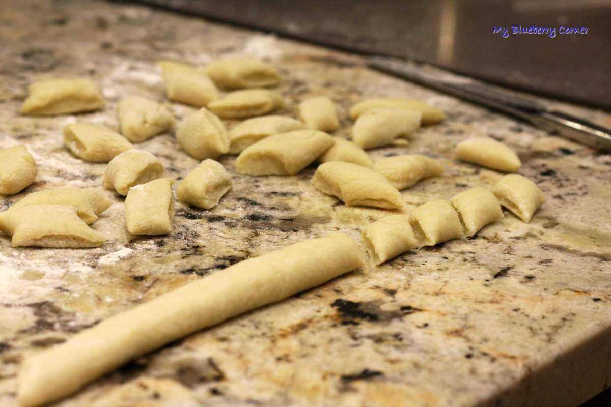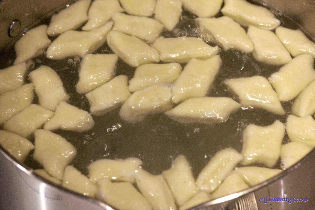 Odłożyć na bok, nakryć miską żeby nie schło. W dużym garnku zagotować posoloną wodę. Z ciasta odkrawać kawałki, z każdego uturlać dość cienki wałek. Wałki lekko przygnieść nożem i pociąć na małe romby.