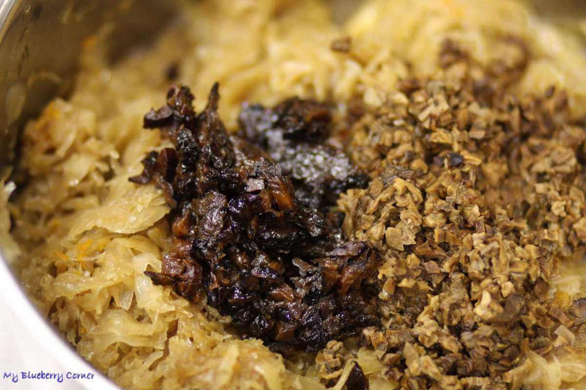 Ostudzić, wyłowić grzyby i pokroić je bardzo drobno, dodać do kapusty. Wodę z gotowania grzybów wlać do garnka, doda kapuście koloru i aromatu. Śliwki pokroić w drobną kostkę i również dodać do kapusty.