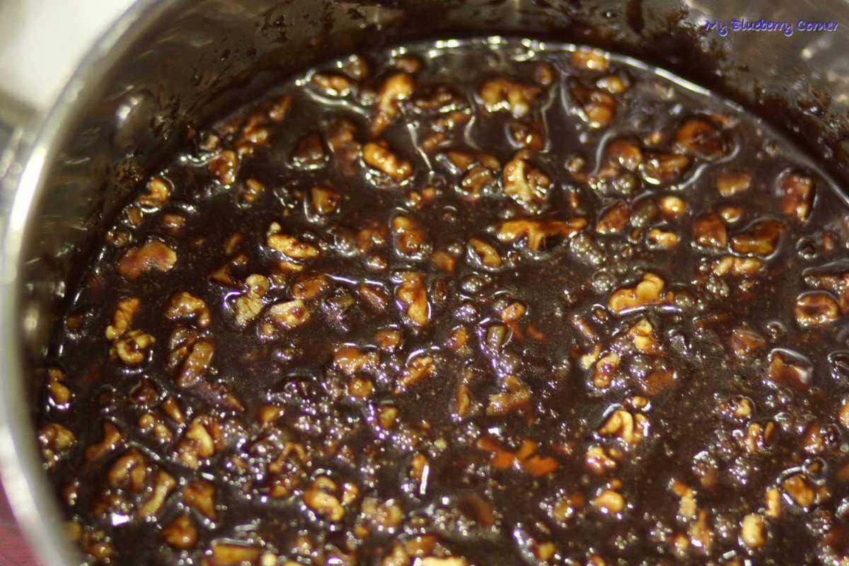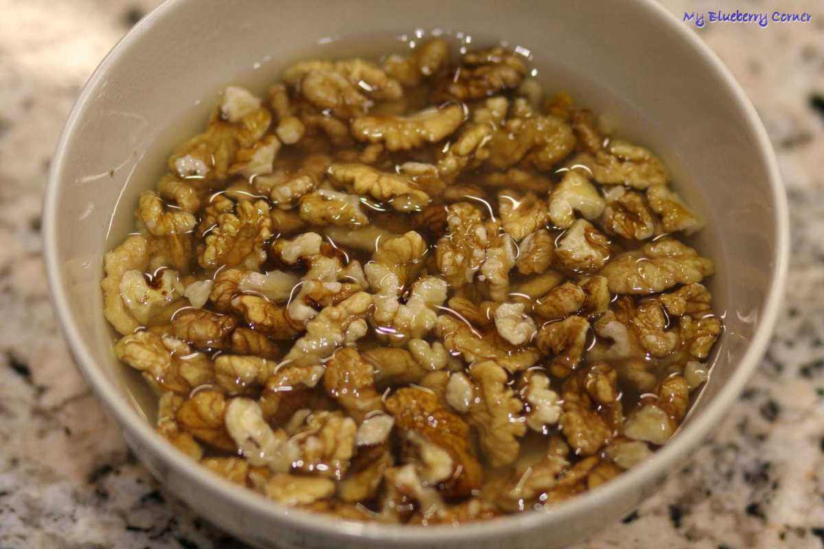 Zmiękczyć orzechy – w misce wymieszać wrzątek z 3 łyżeczkami cukru. Do tego wrzucić orzechy i pozostawić na 30 minut.