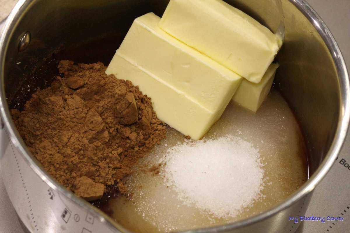 Po tym czasie orzechy odcedzić i pokroić na drobniejsze kawałki. Do rondla wlać gorącą wodę, dodać cukier, masło, ekstrakt migdałowy i kakao.