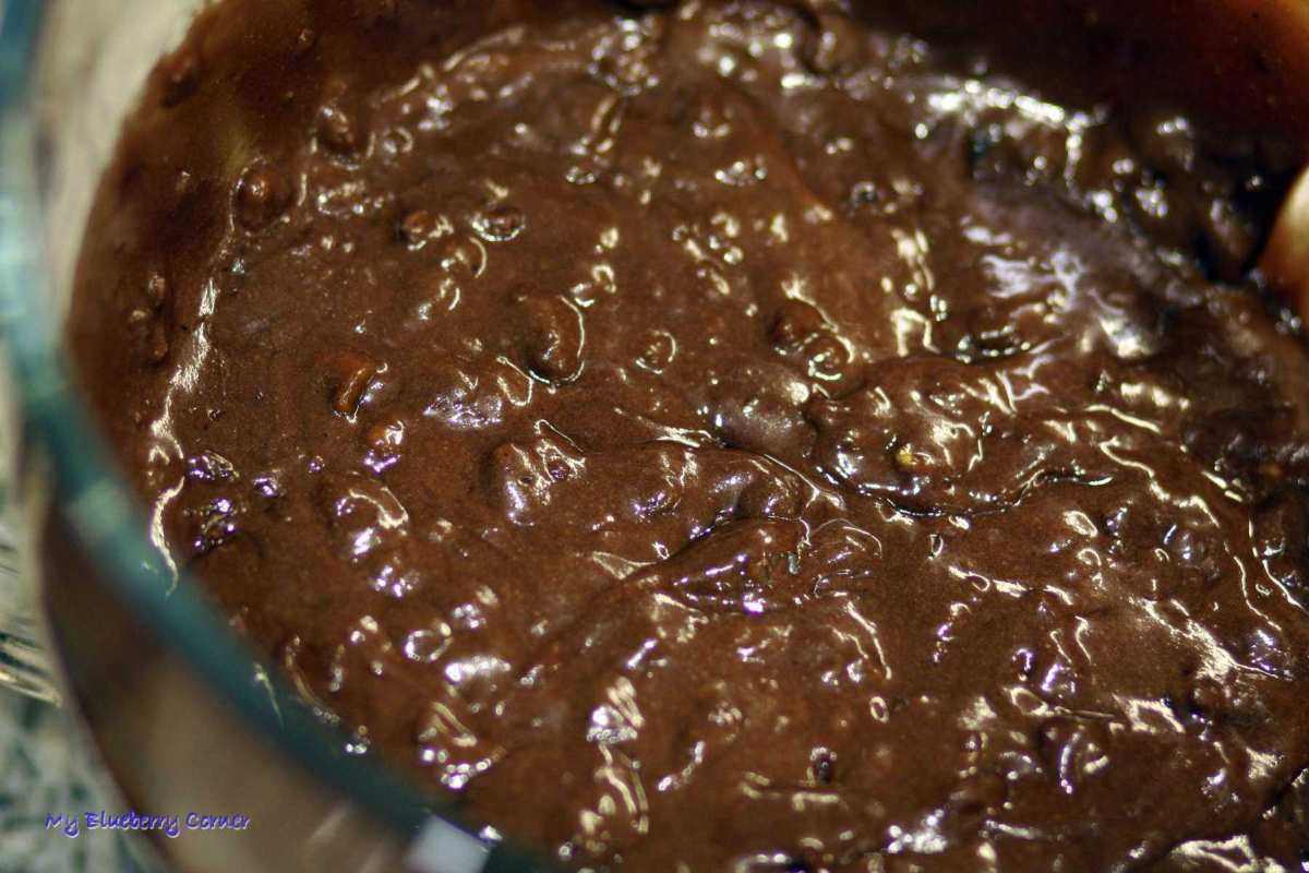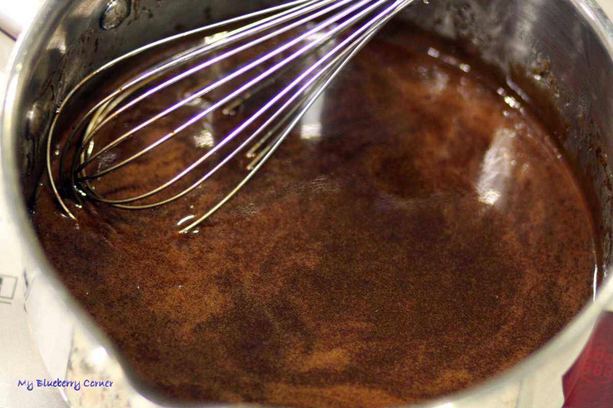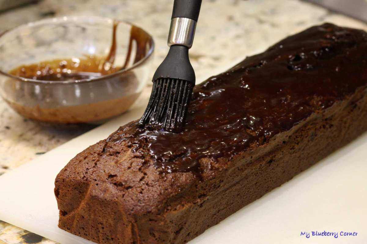 Odłożoną polewę podgrzać – masa się rozrzedzi. Przy pomocy łyżeczki lub silikonowego pędzla rozlać na górę murzynka.