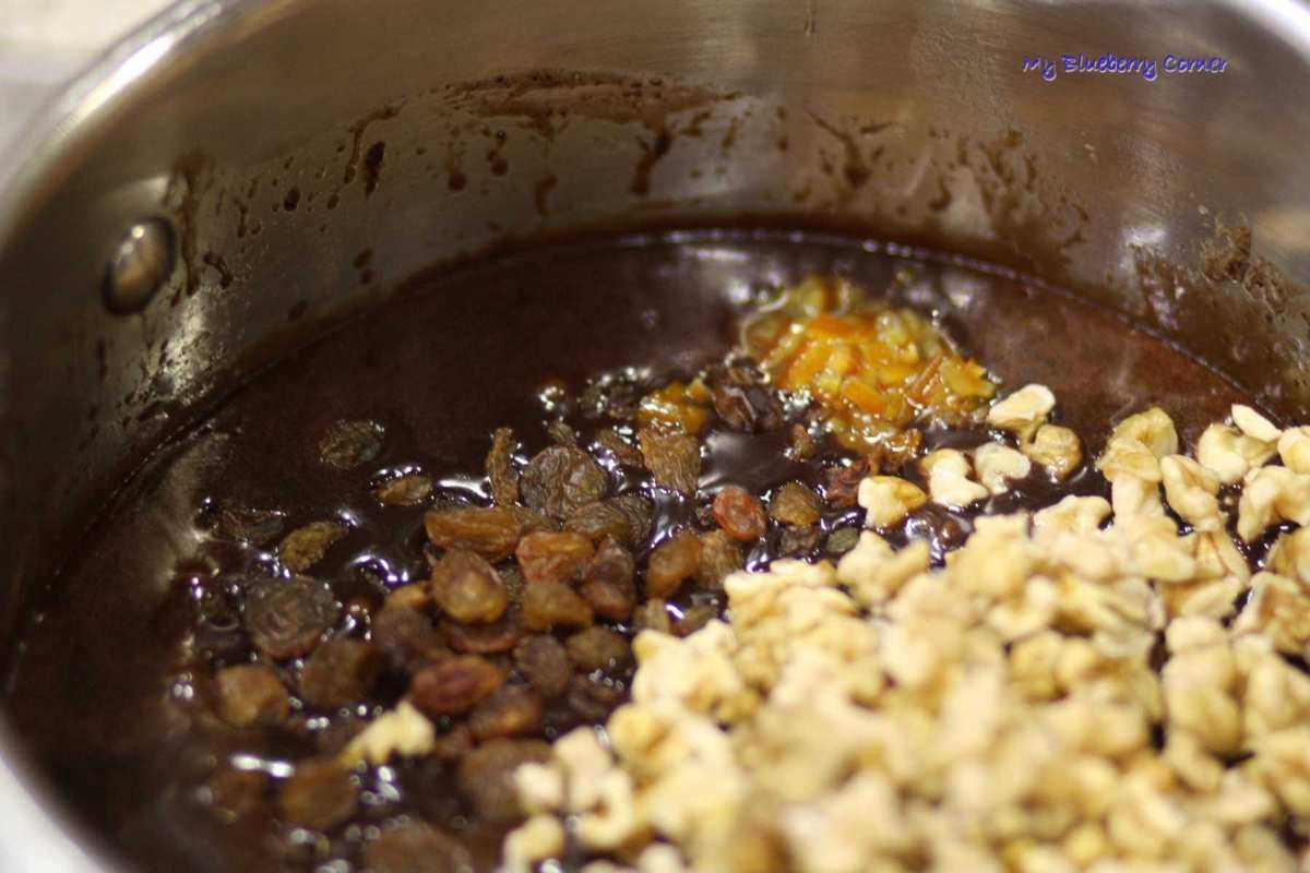 Do pozostałej, gorącej masy dodać orzechy, rodzynki oraz skórkę pomarańczową.