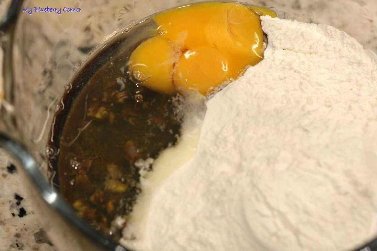 Do zimnej masy dodać jajka i mąkę wymieszaną z proszkiem do pieczenia.
