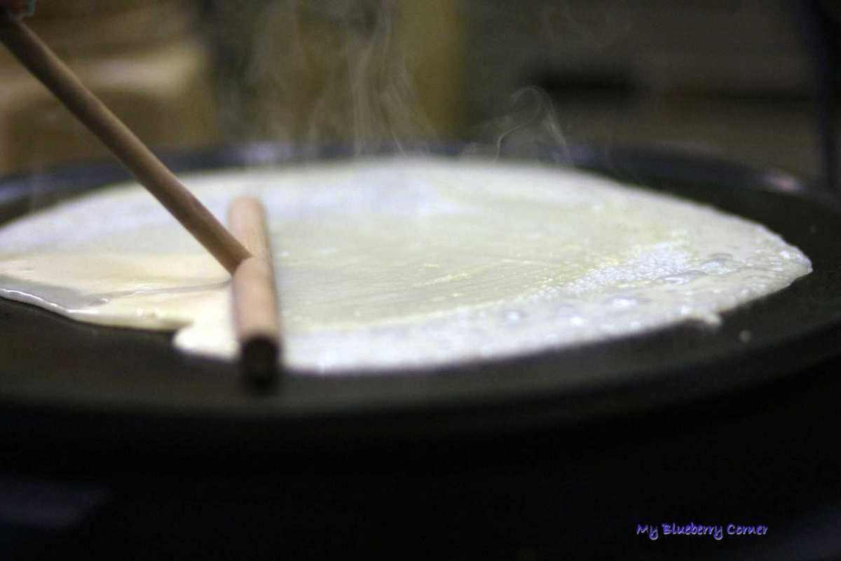 Odstawić do lodówki na min. 30 minut. Następnie na średniej wielkości patelni (lub maszynce do smażenia naleśników) smażyć bardzo cienkie naleśniki.