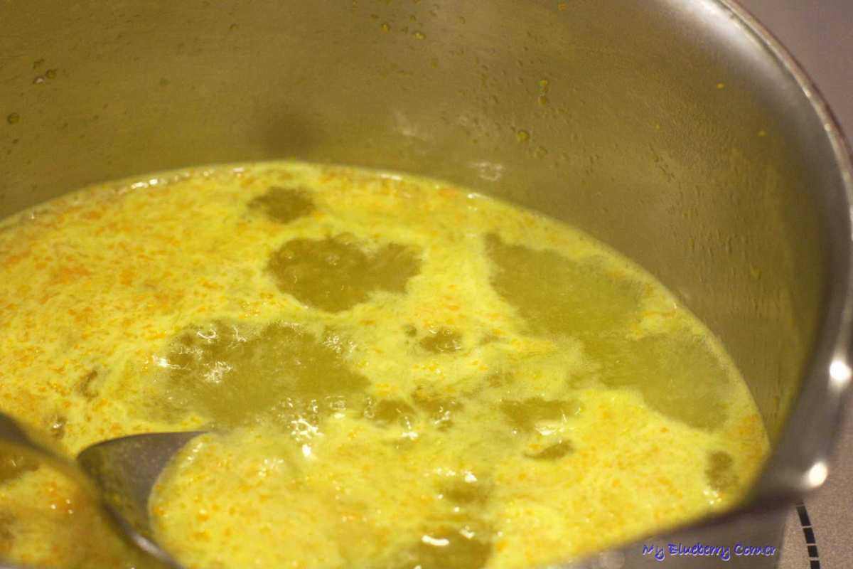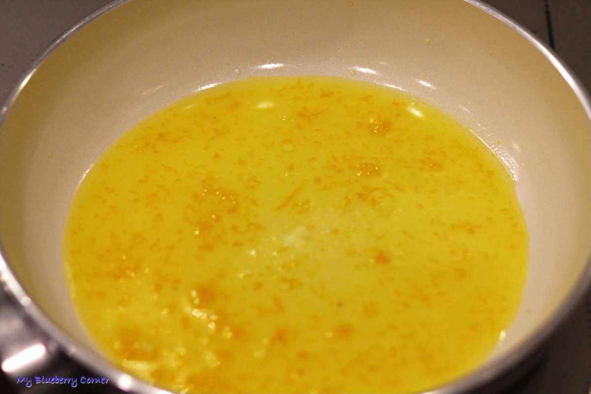 Gdy wszystkie będą już usmażone przygotować pomarańczowy sos. Pomarańczkę sparzyć wrzątkiem. Skórkę zetrzeć na tarce prosto do niedużego rondla, dodać cukier. Pomarańczę przekroić na pół i wycisnąć z niej cały sok (powinno go być ok. 200 ml), wlać do rondla. Do tego dodać likier z gorzkich pomarańczy. Całość grzać na średnim ogniu, ciągle mieszając. Gdy płyn się zagotuje, zdjąć z ognia i dodać masło.