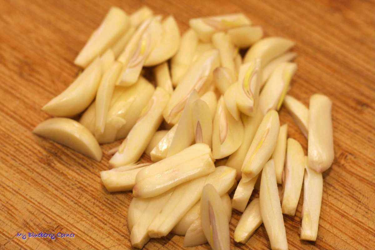 Czosnek obrać, ząbki pokroić w słupki.