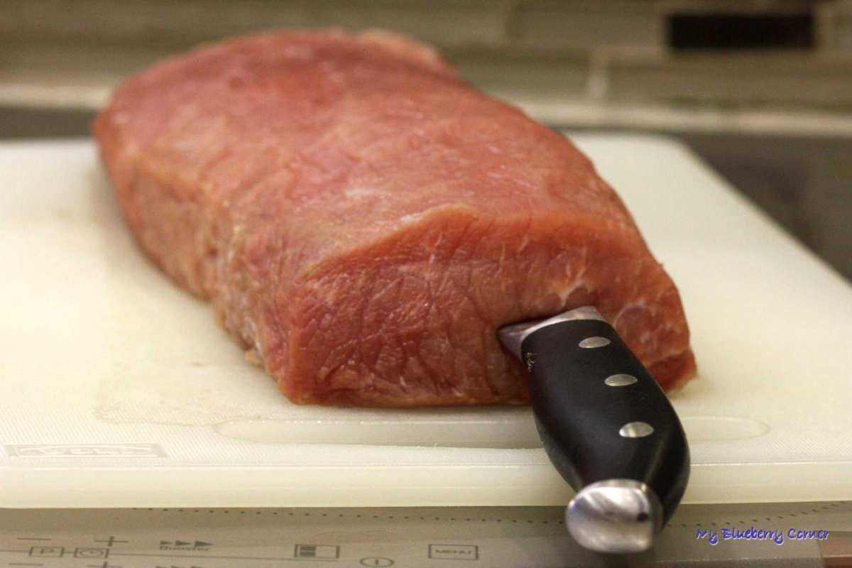 Wewnątrz schabu zrobić dziurę (naciąć go cienkim, ostrym nożem przez środek wzdłuż). W powstały otwór włożyć sztywną, zmrożoną polędwiczkę i odłożyć do czasu, aż się rozmrozi.