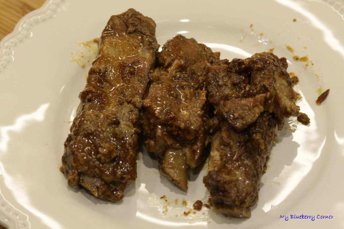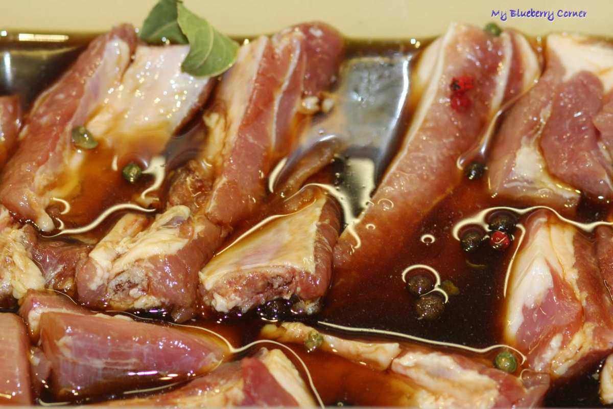 Żeberka pokroić na porcje. Każda porcja powinna zawierać jedną kostkę. Kawałek, gdzie nie ma kości pokroić według uznania. Do garnka włożyć pokrojone mięso, liście laurowe, ziele angielskie, pieprz i chili. Zalać to sosem sojowym i wodą (powstały płyn powinien prawie przykryć mięso).