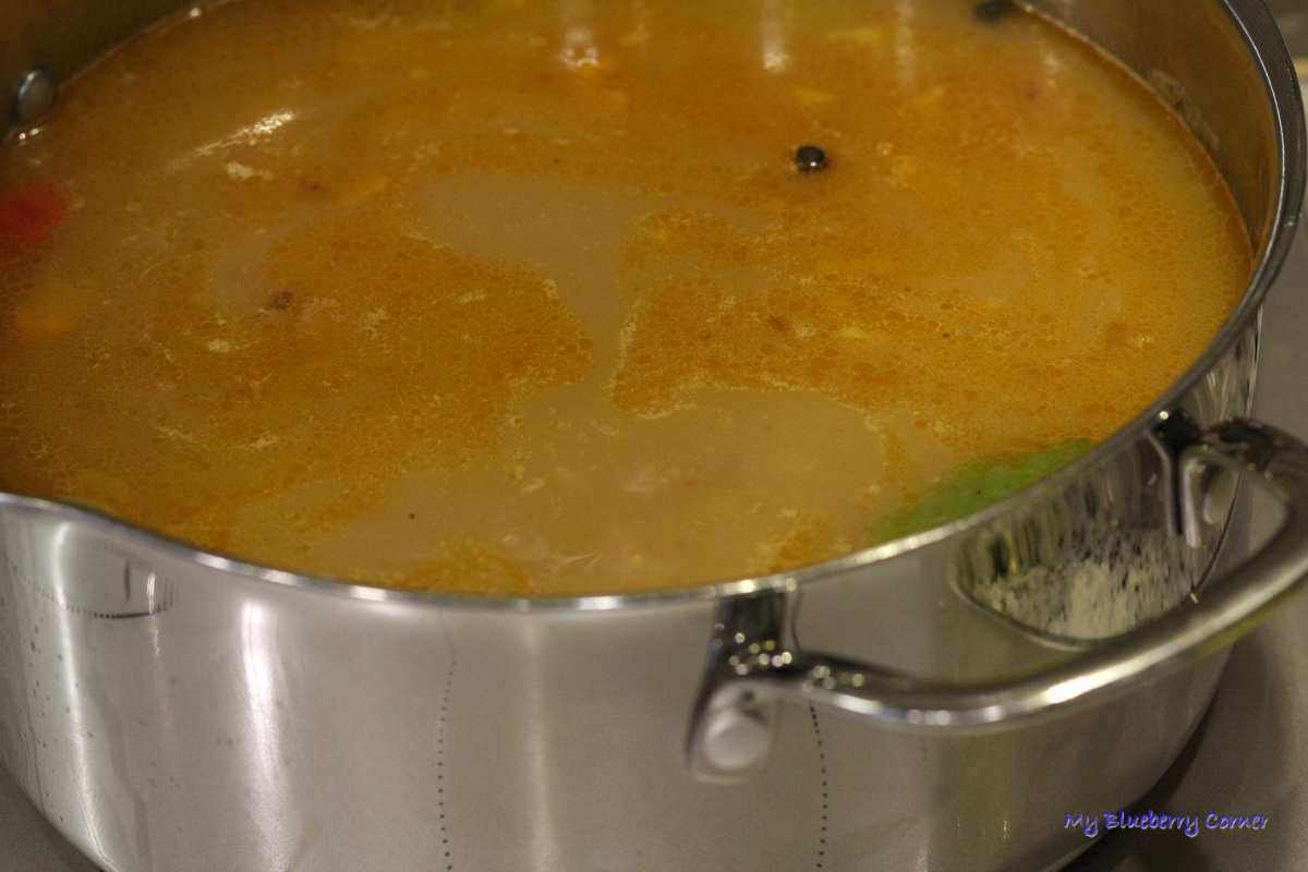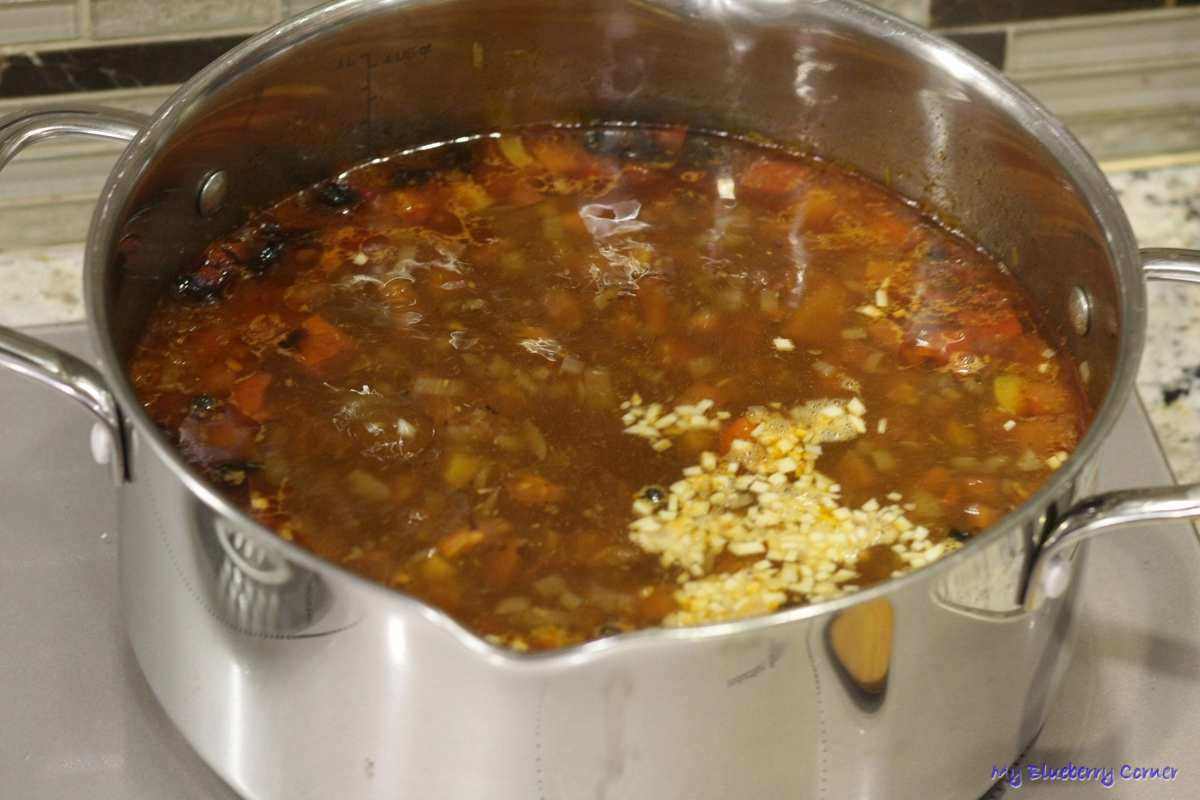 Przełożyć do garnka z gotującą się wodą. Łyżką wazową wody z garnka zdeglasować patelnię, przelać do garnka i gotować ok. 1½ godziny.