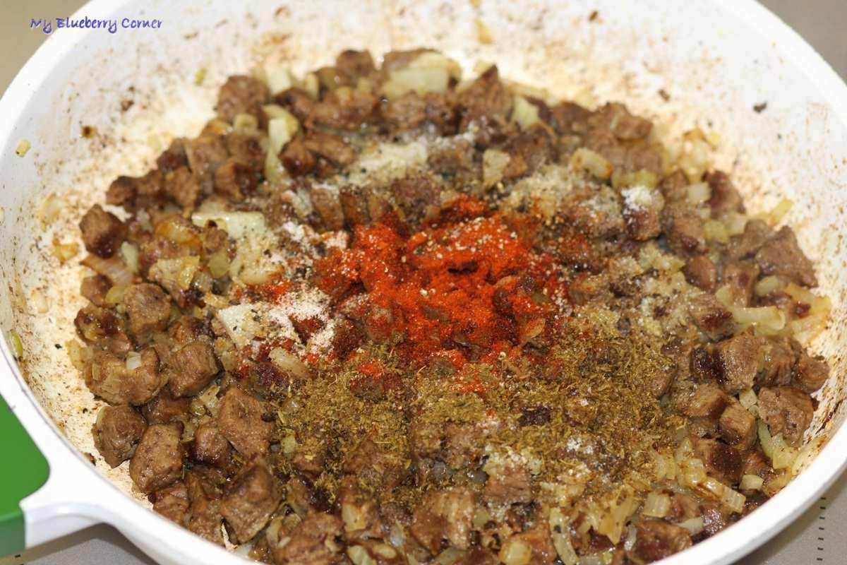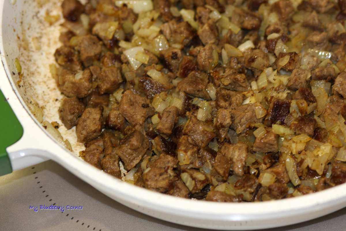 Mięso pokroić w kostkę i podsmażyć na oleju. Cebulę obrać i drobno posiekać, dodać do zrumienionej wołowiny i podsmażyć.