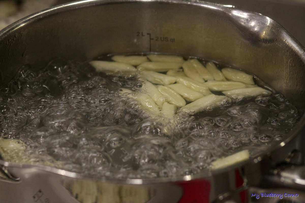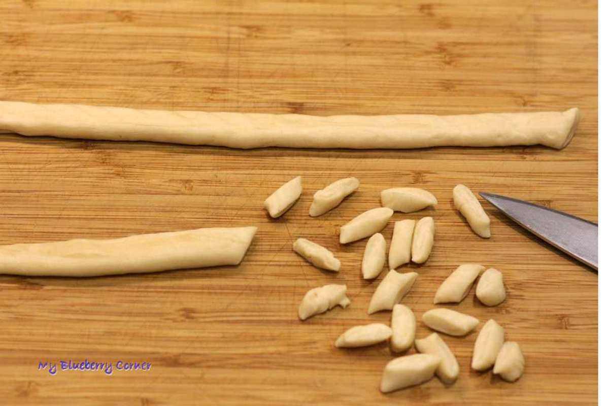 Uformować cienkie wałeczki, spłaszczyć a następnie drobno pokroić.