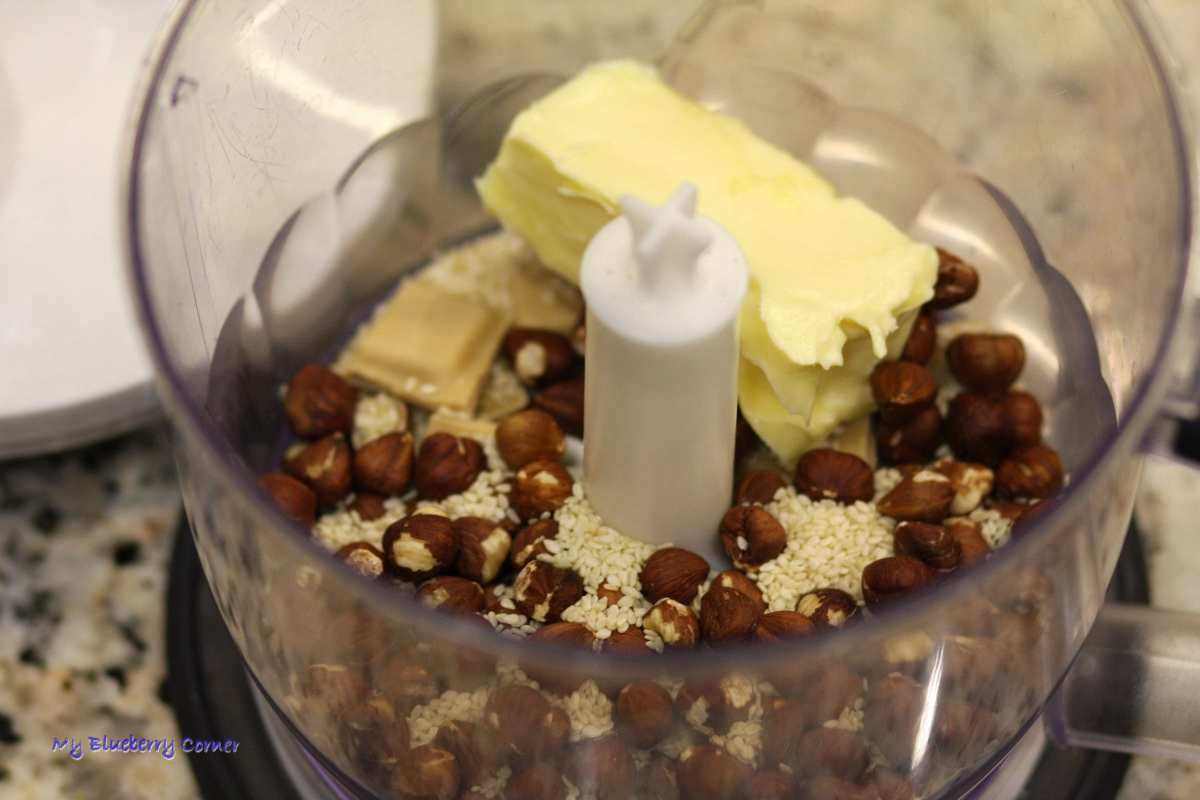 W malakserze posiekać razem „Karmelową”, masło, sezam i orzechy.