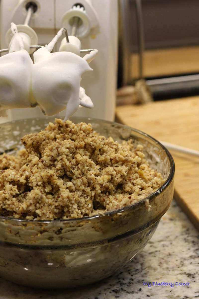 W oddzielnej misce ubić białka na sztywną pianę i połączyć z orzechami w jedną masę.