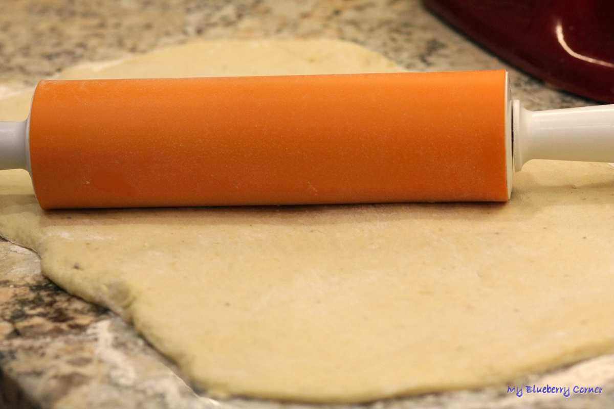 Ciasto po wyrośnięciu (gdy podwoi swoją objętość) wyłożyć na oprószony mąką blat i rozwałkować na prostokąt o grubości ok. 0,5 cm.