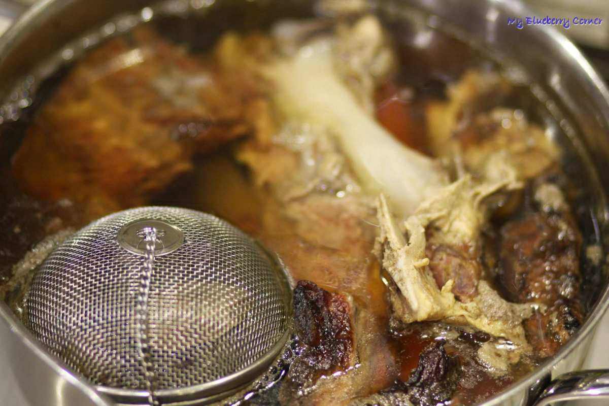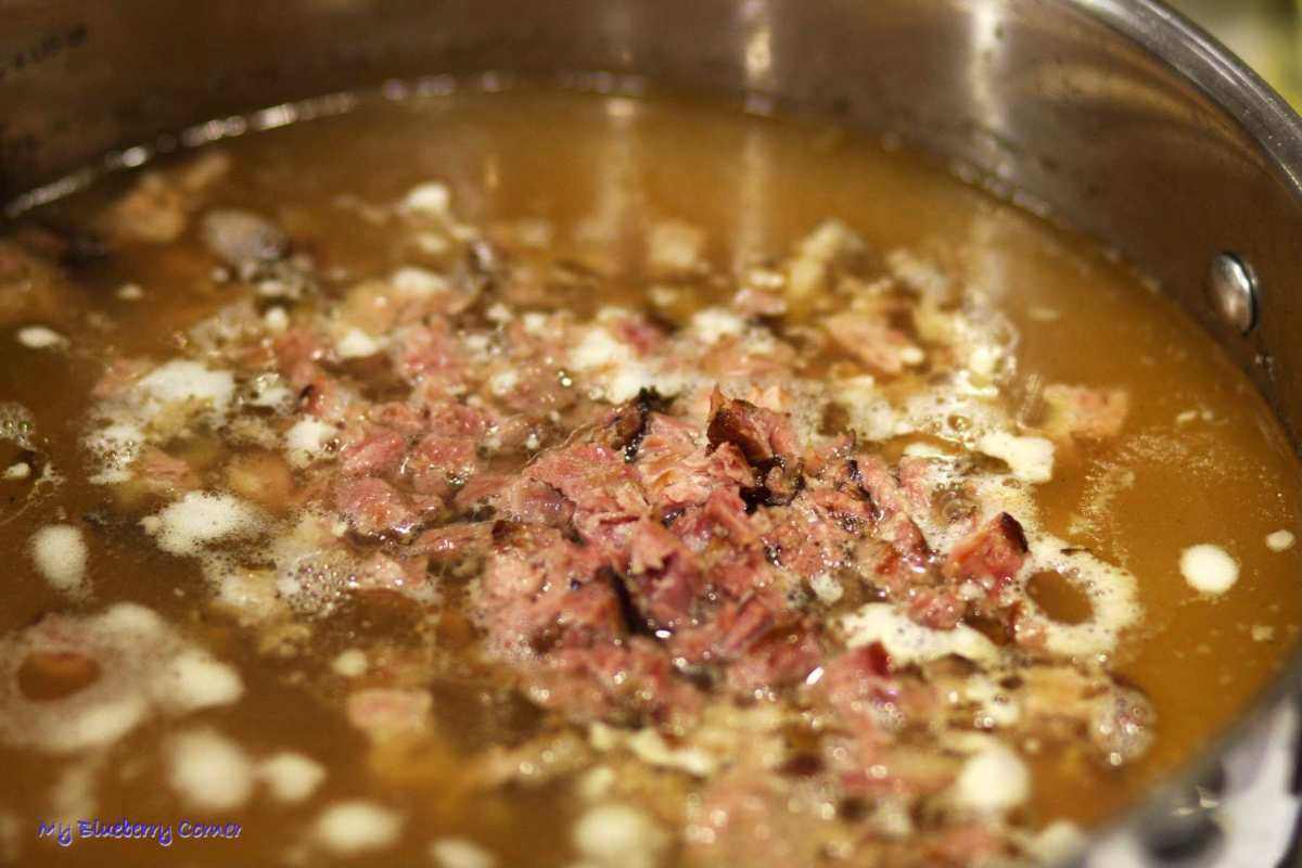 Do garnka wlać 2 i ½ litra wody i włożyć przekrojone na trzy części wędzone żeberka. Marchewkę i pietruszkę obrać i dodać do garnka razem z porem, listkiem laurowym, zielem angielskim, pieprzem i solą.