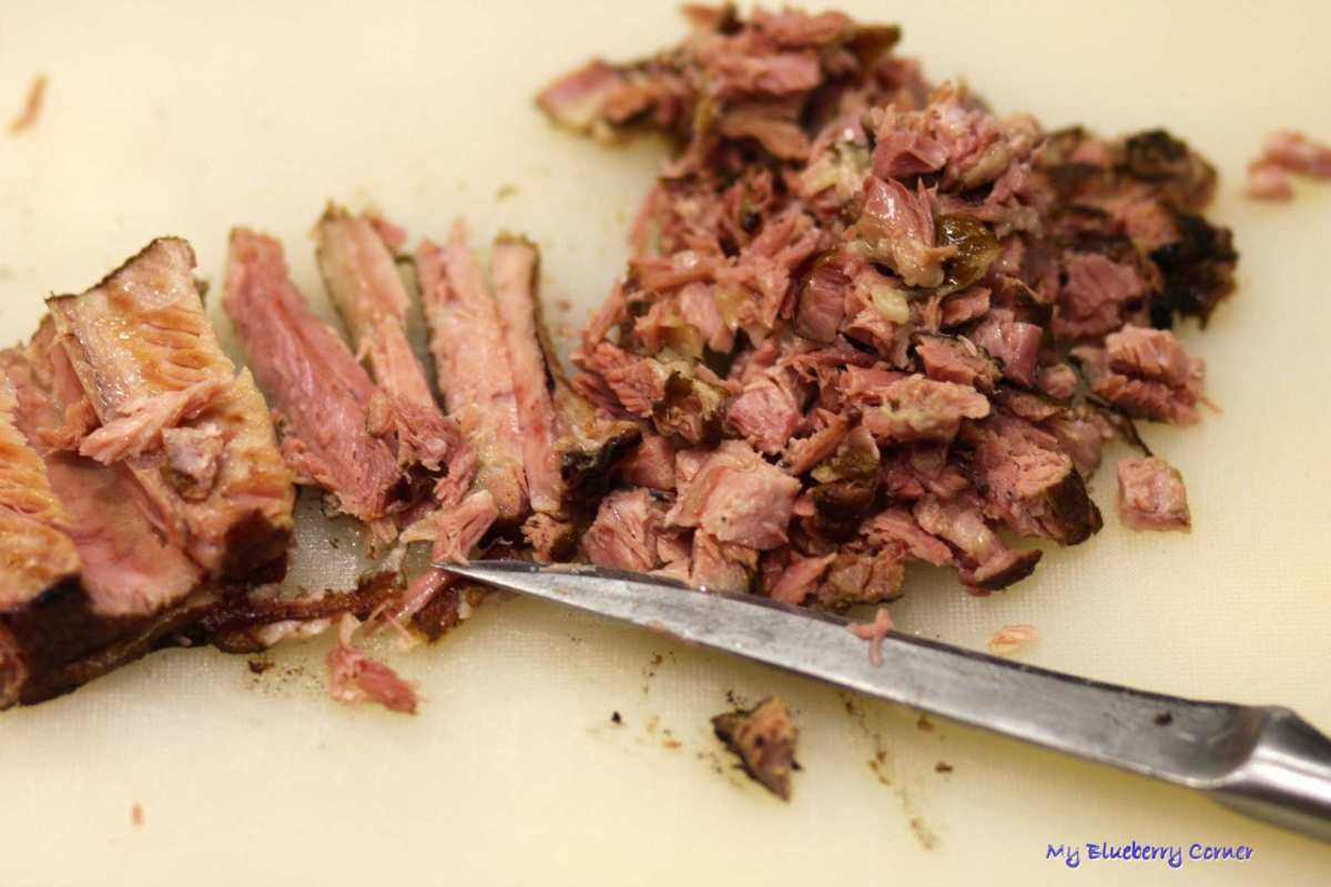 Z żeberek usunąć kości i chrząstki, pokroić mieso na drobne kawałki.