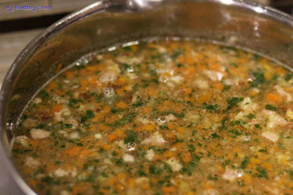 Wszystko gotować do czasu aż marchewka i pietruszka będą miękkie. Wyłowić wszystkie jarzyny i przyprawy. Marchewkę, pietruszkę i żeberka odłożyć do wystudzenia. Do gotującego się wywaru dodać łuskany groch i gotować przez 30 minut.