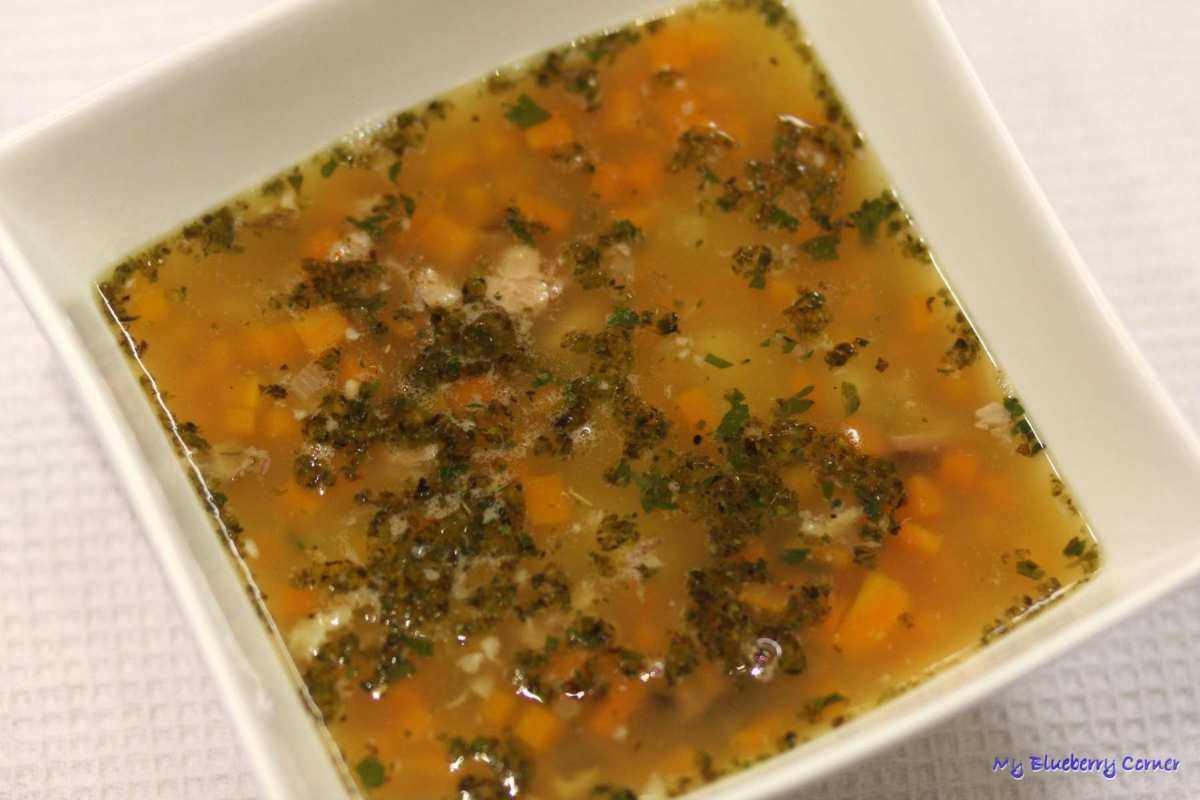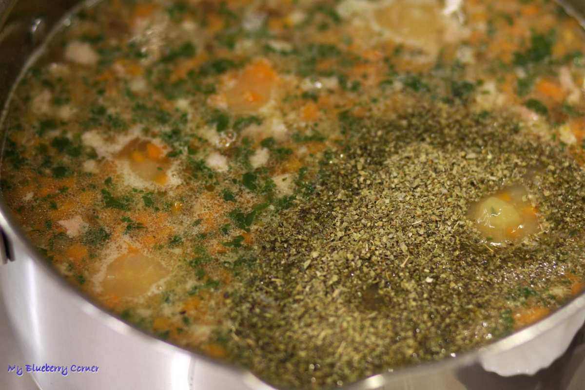 Gotować 10 minut. Na koniec dodać majeranek – należy rozetrzeć go w dłoniach – wtedy uwalnia więcej aromatu.