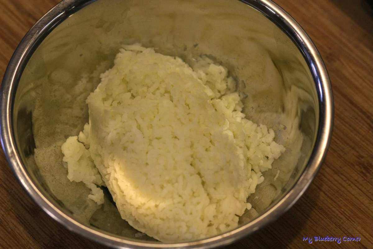 Ziemniaki obrać, pokroić i ugotować w posolonej wodzie. Jeszcze gorące przecisnąć przez praskę i odstawić do wystudzenia.