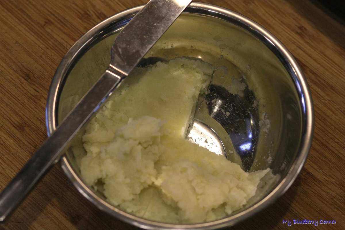 Zimne ziemniaki włożyć do miski, przycisnąć do dna i wyrównać powierzchnię. Przekroić ziemniaki na krzyż, wyjąć jedną ćwiartkę na pozostałe.