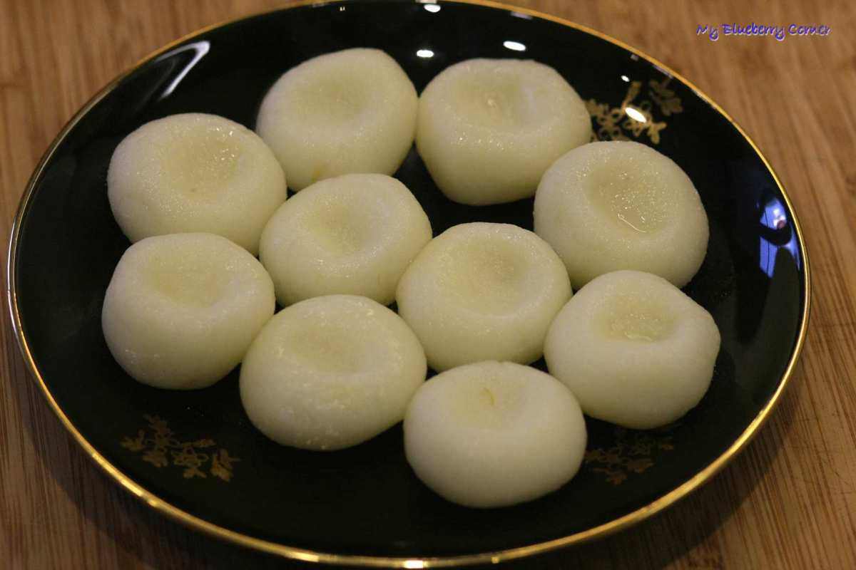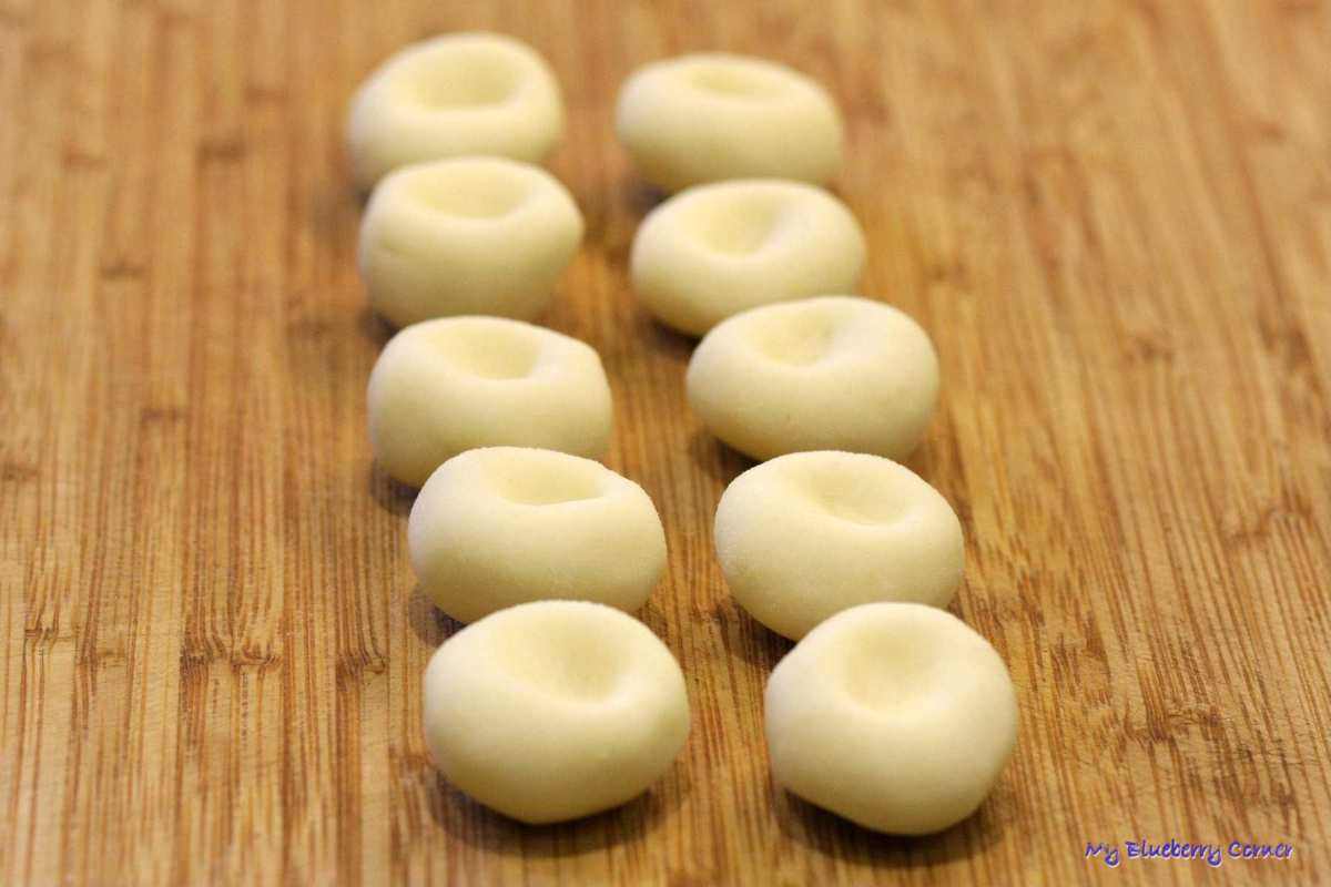 Odrywać po kawałku ciasta i formować małe kulki. W środku każdej kulki zrobić dołek, wciskając lekko palec.