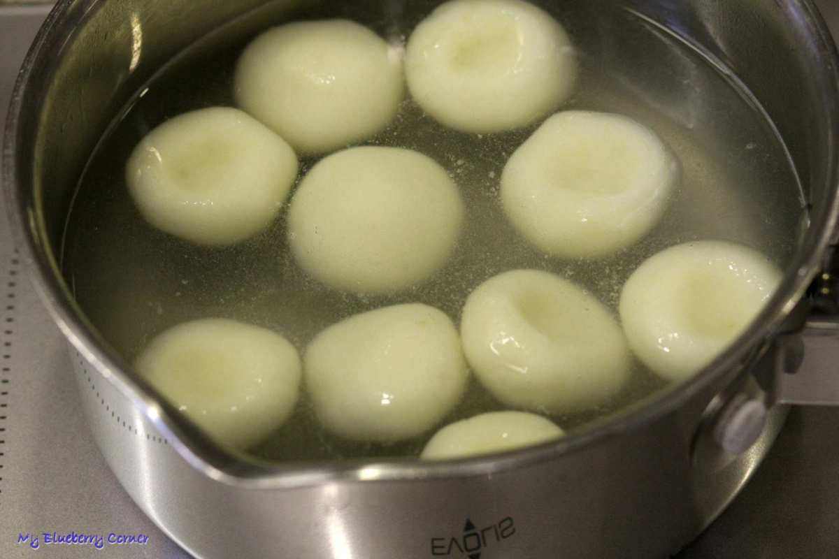 Kluski gotować w posolonym wrzątku. Gdy wypłyną, gotować jeszcze przez 2 minuty, odcedzić.