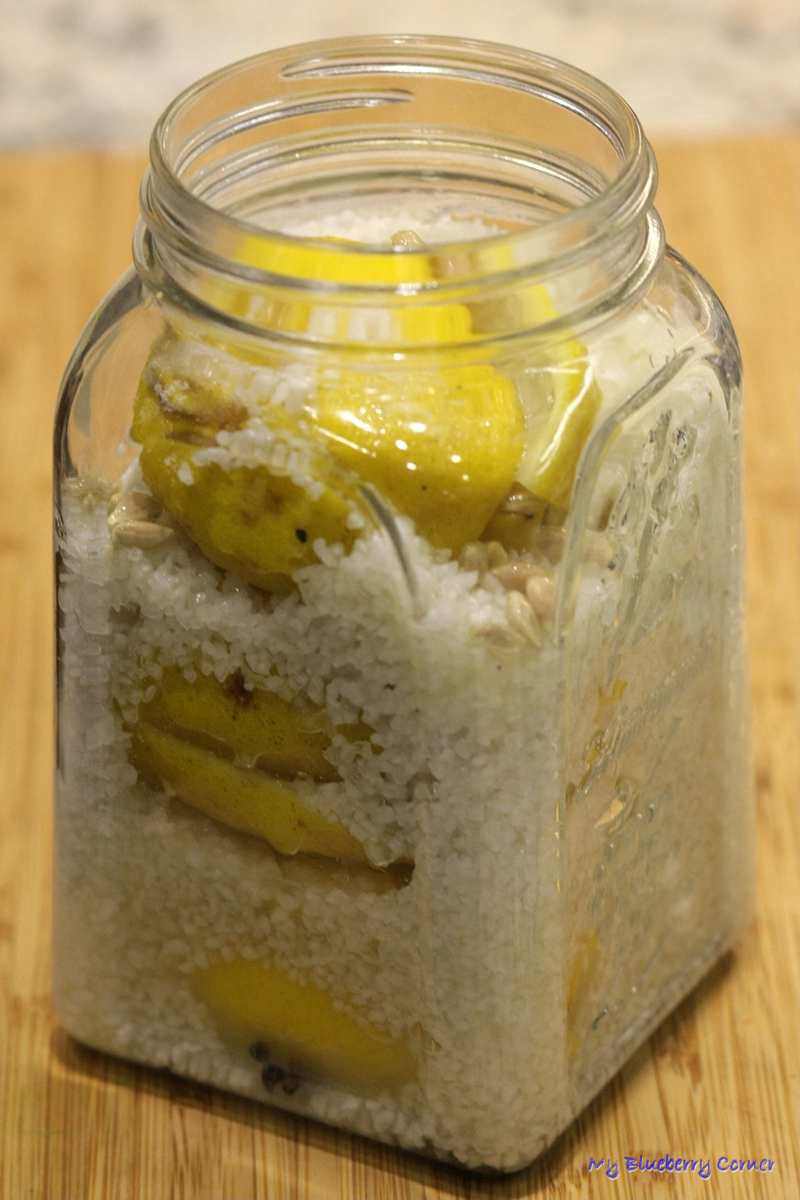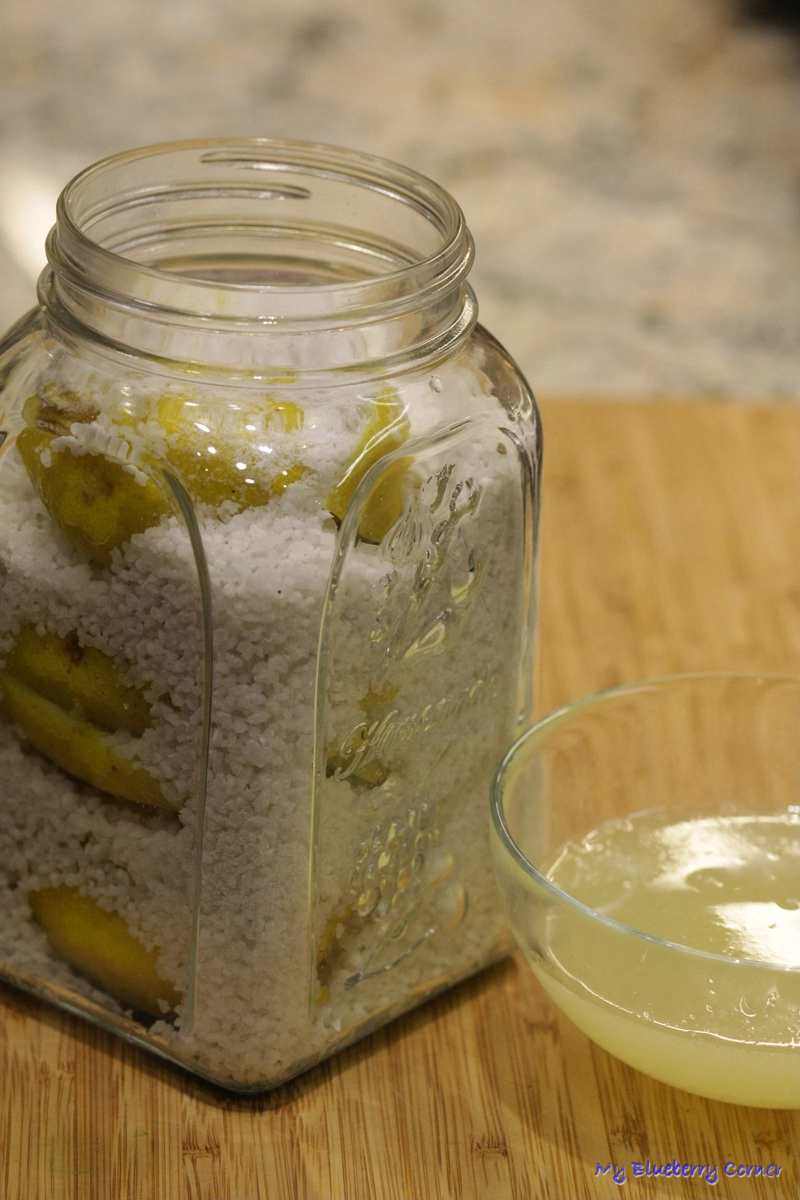 Zakręcić i odstawić, codziennie wstrząsając, aż do całkowitego rozpuszczenia soli. Marynowane cytryny przechowywać w lodówce.