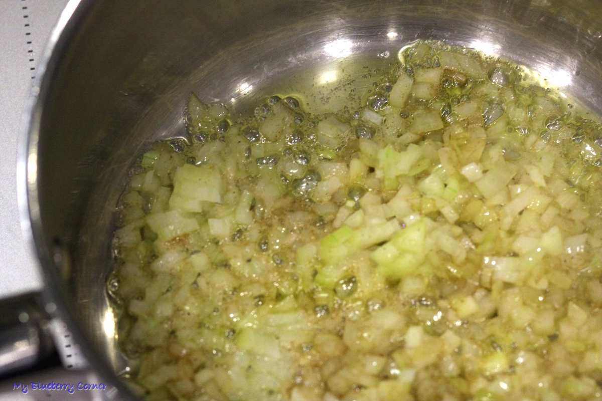 W rondlu rozgrzać razem oliwę i masło, podsmażyć obraną i drobno posiekaną cebulę.
