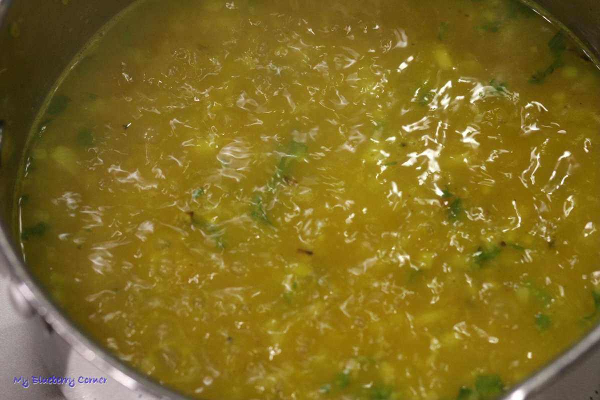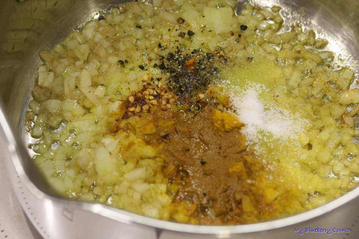 Do cebuli dodać kurkumę, chili, pieprz, sól i zielone zioła, smażyć przez 1 minutę.