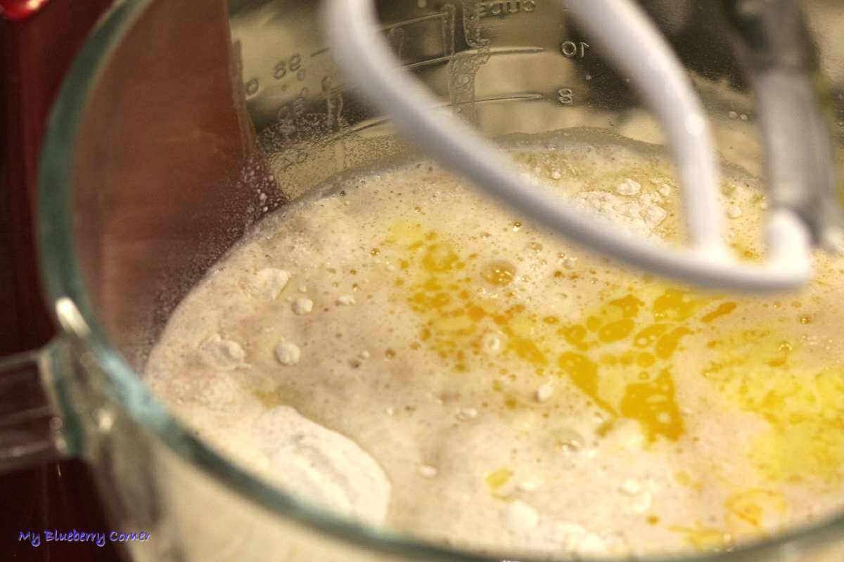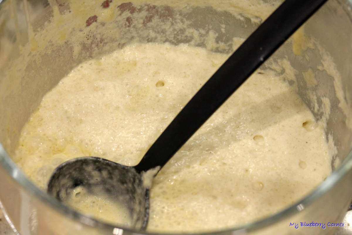 Odstawić ciasto na ½ godziny do wyrośnięcia. Ciasto będzie dość rzadkie, z mnóstwem małych bąbelków.