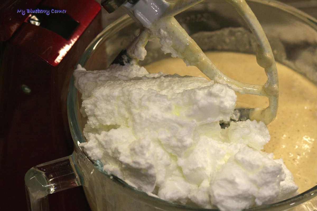 Odstawić na chwilę. W tym czasie ubić białka na sztywno, dodać do miski z ciastem i delikatnie wymieszać mieszadłem lub łyżką, dokładnie łącząc wszystkie składniki.
