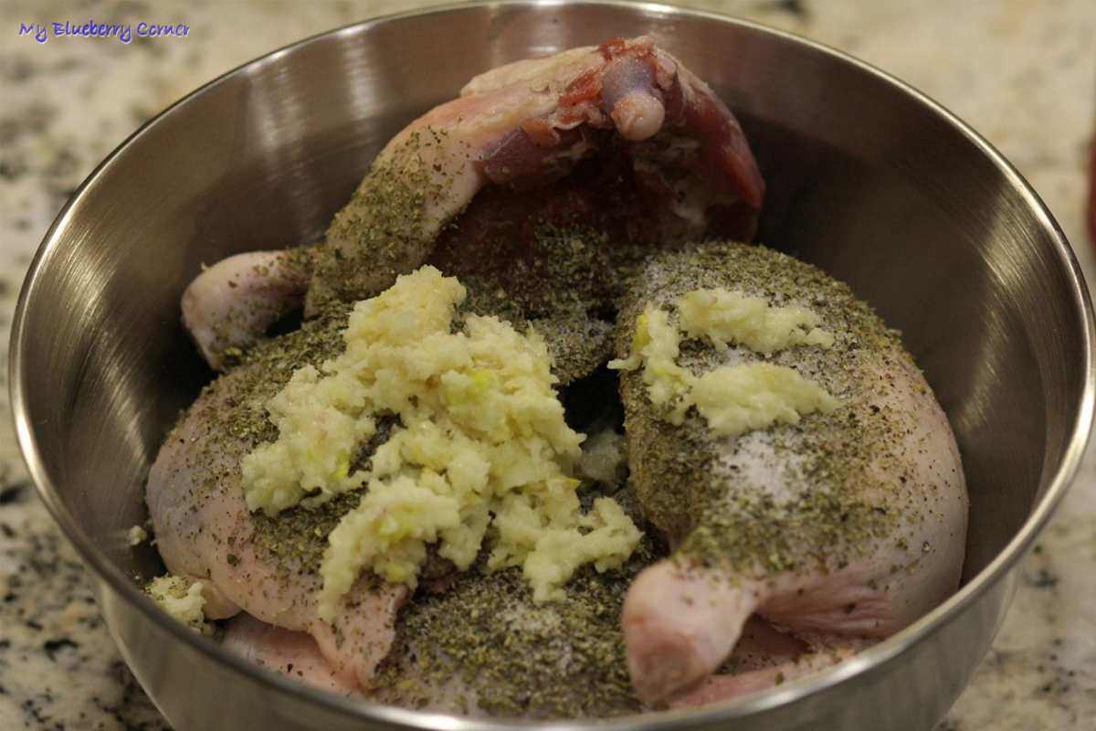 Natrzeć solą pieprzem, przeciśniętym przez praskę czosnkiem oraz majerankiem.
