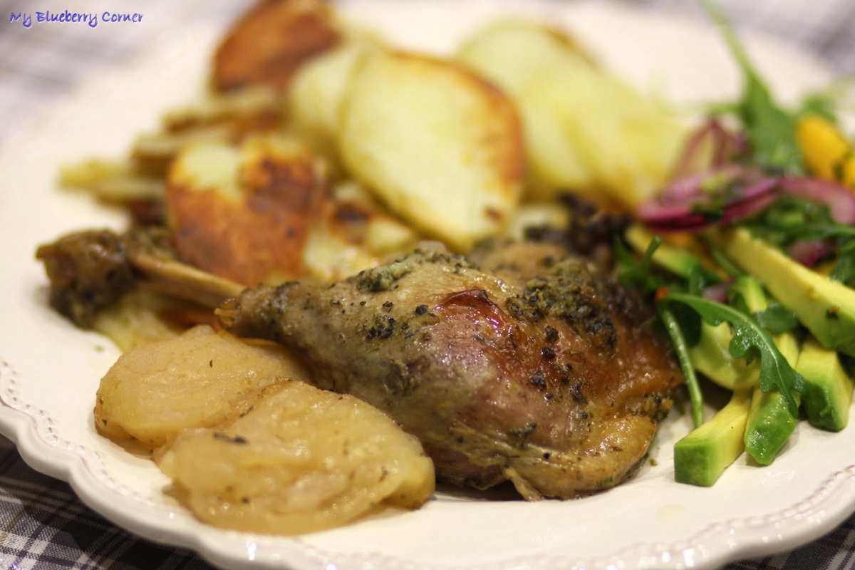 Kacze nogi pieczone z jabłkami podawać z ulubionymi dodatkami – u mnie ze smażonymi plasterkami ziemniaków, z egzotyczną sałatką lub żurawiną.
