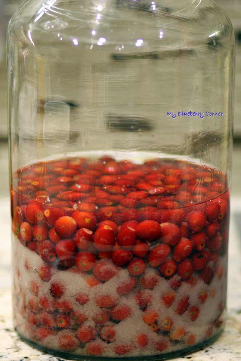 Dzięki temu owoce łatwiej oddadzą smak do nalewki. Do dużego słoja wsypać wszystkie owoce róży, dodać cukier i ½ litra wódki.