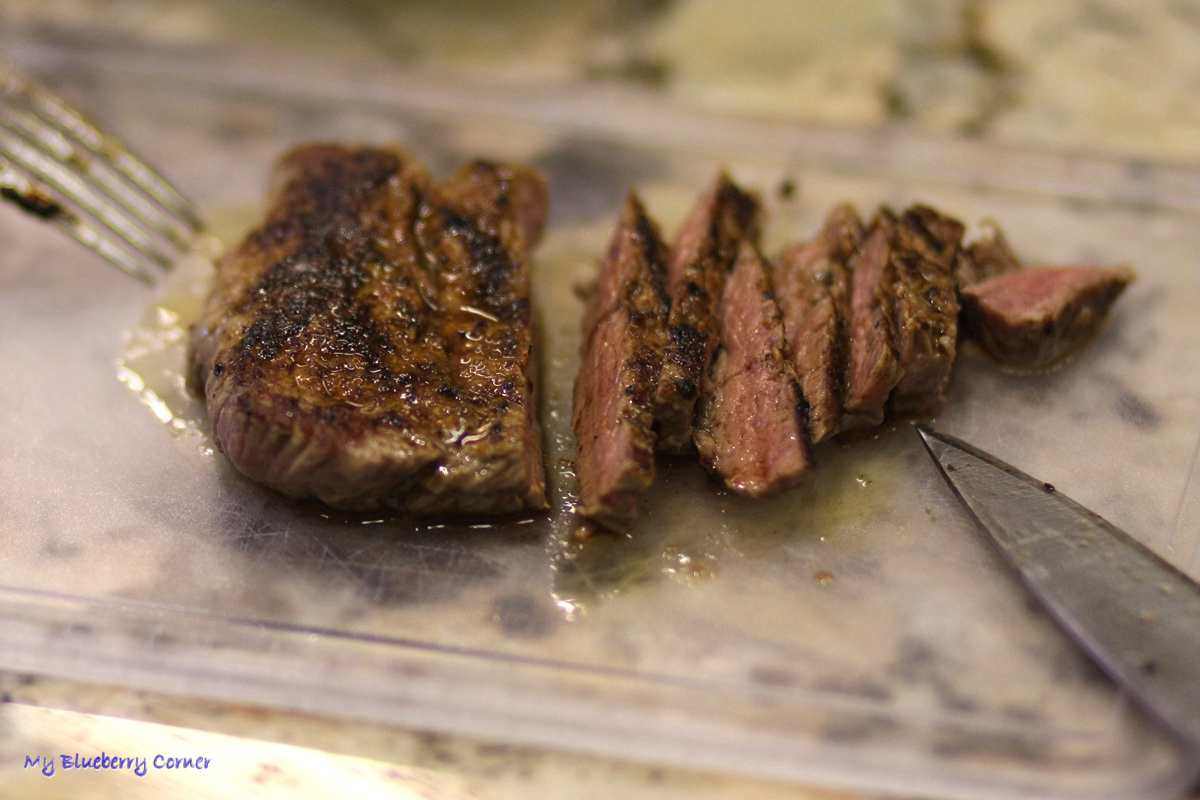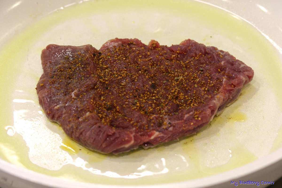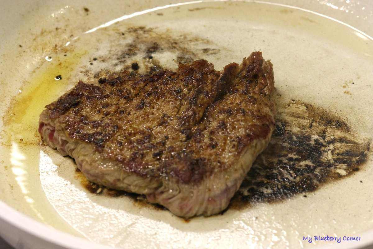 Zdjąć z patelni i odłożyć na 3 do 5 minut na deskę do krojenia. Po tym czasie pokroić mięso i cienkie paski.
