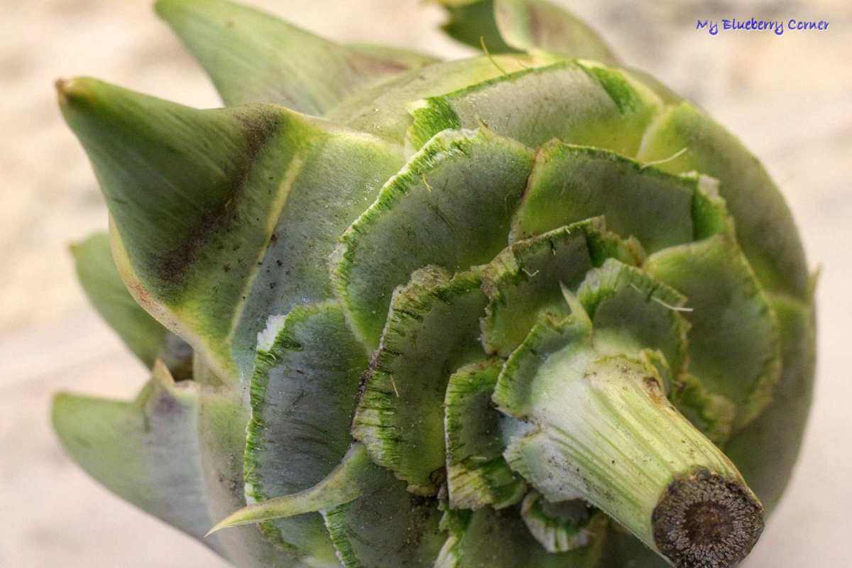 Karczochy przygotować według schematu: Kwiat karczocha obrać z dolnych liści, obłamując je u podstawy.