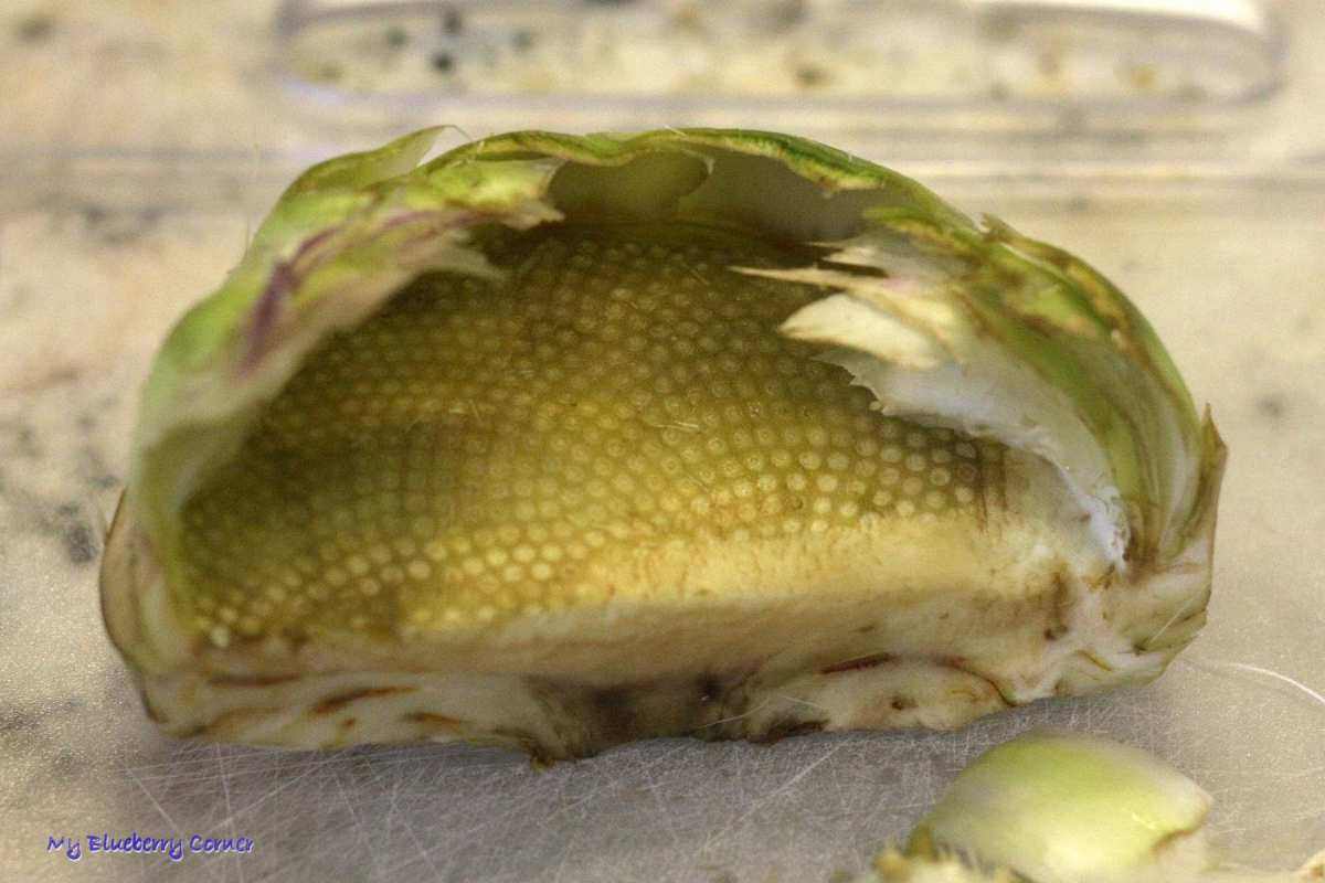 Wewnątrz kwiatu ujawni się wnętrze, wypełnione sztywnymi niejadalnymi igiełkami.