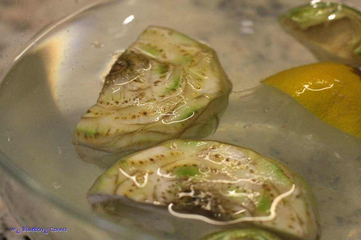 Oczyszczone kwiaty karczocha włożyć do zimnej wody wymieszanej z sokiem z połowy cytryny.