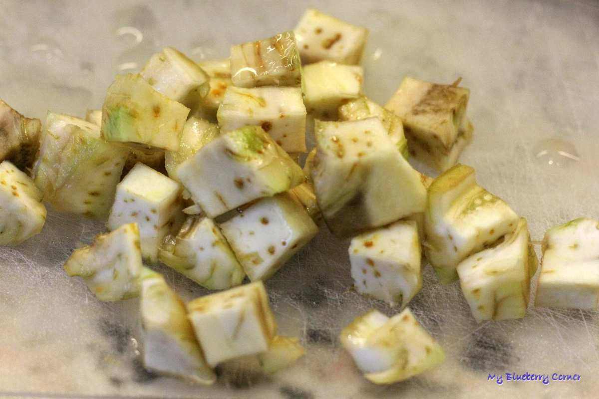 Czosnek i cebule obrać i drobno pokroić. Pomidorki sparzyć i obrać ze skóry. Karczocha wyjąć z wody i pokroić w kostkę.