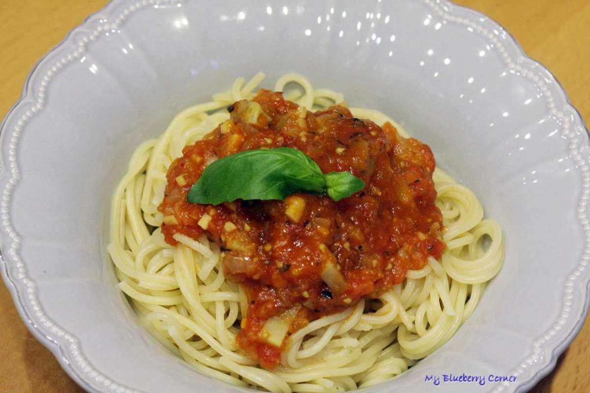 Spaghetti z karczochem w pomidorowym sosie to lekkie ale sycące, wegańskie danie. W zeszłym roku posadziłam na działce karczocha. Wyrósł pięknie i miał 3 kwiatostany. Karczoch jest mało wymagającym warzywem, łatwym w uprawie. Jest mało popularny w Polsce, jeszcze nie widziałam go świeżego na sklepowych czy bazarowych półkach. Karczoch zawiera inulinę, dobry cukier dla diabetyków. Wyciąg z karczocha pobudza wydzielanie żółci i zwiększa jej ilość. Działa rozkurczowo na pęcherzyk żółciowy i przewody żółciowe, co umożliwia lepszy przepływ żółci i soku trzustkowego do dwunastnicy. Nieznacznie obniża poziom cholesterolu i trójglicerydów w surowicy krwi, działa również ochronnie na miąższ wątroby. Kwiaty karczocha można jeść po uprzednim ugotowaniu, usmażeniu lub upieczeniu. Świetnie smakują z makaronami, owocami morza i jako dodatek do sałatek. Karczoch dobrze komponuje się z jajkami, pomidorami i anchois. Najlepszymi dodatkami do potraw z karczocha są cytryna, parmezan oraz zioła.