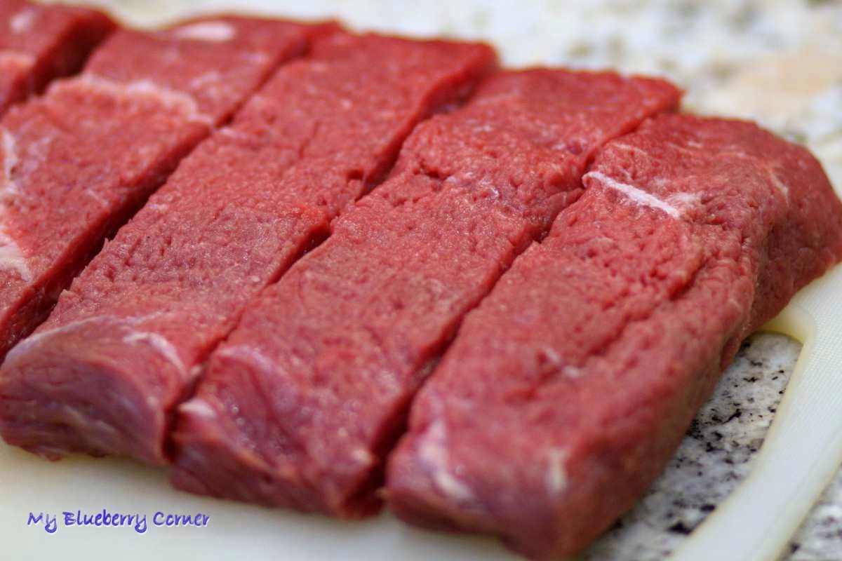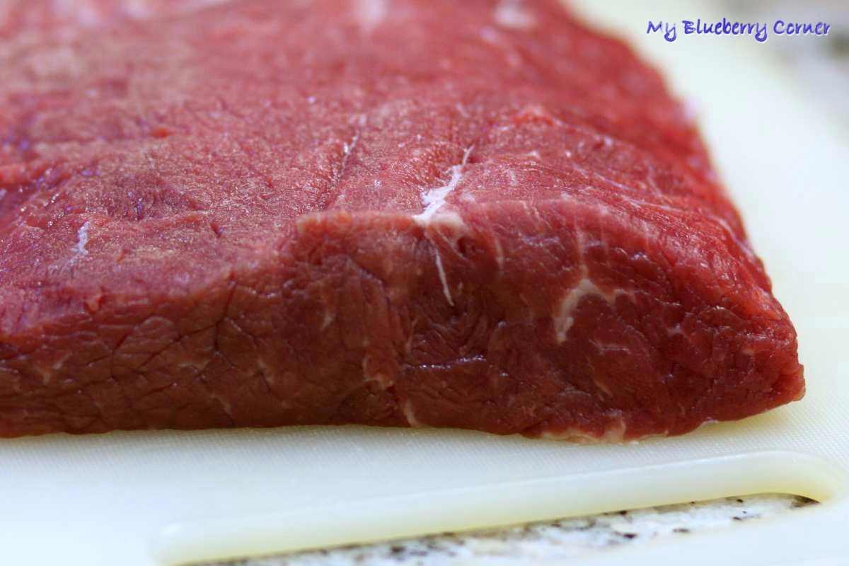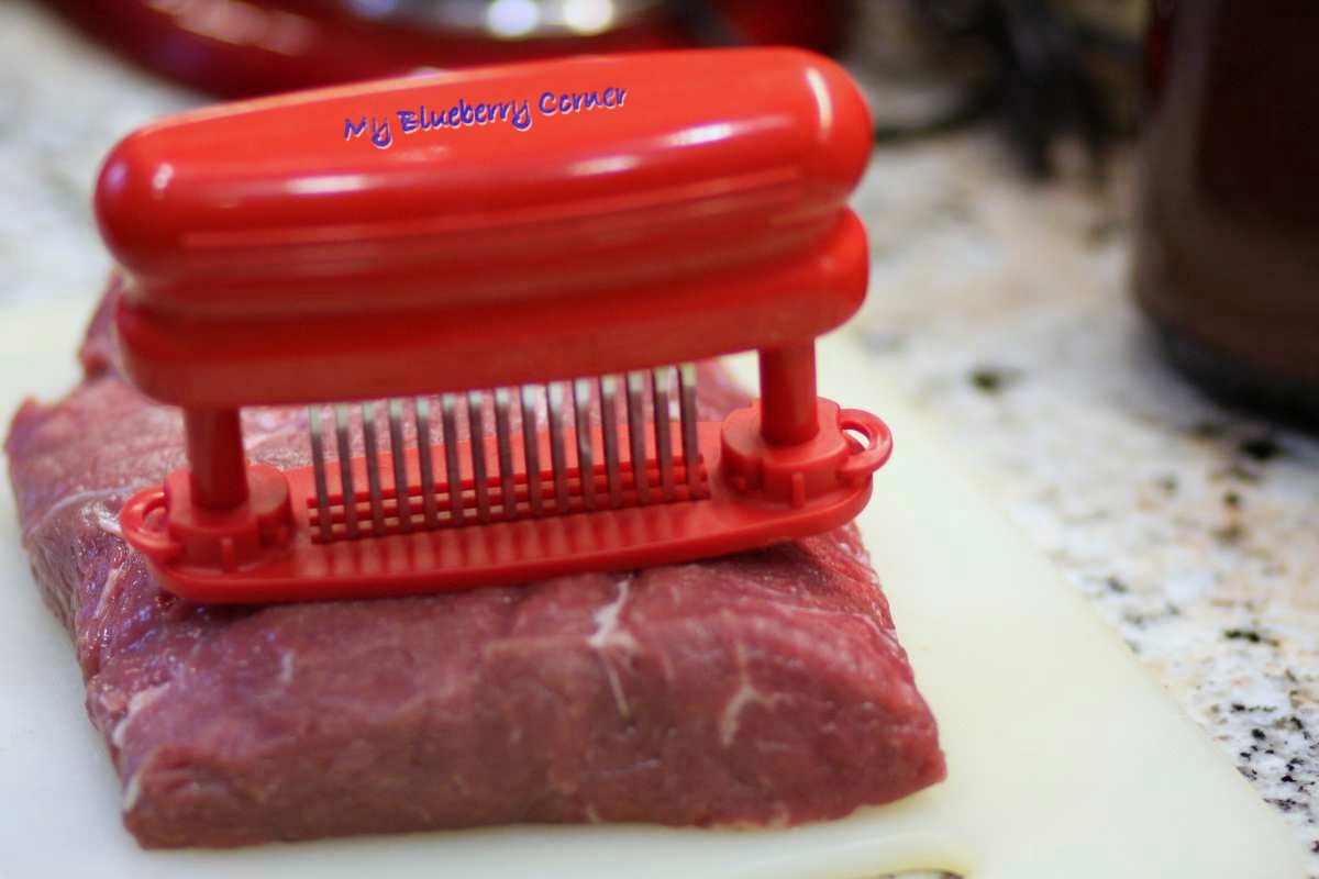Głównym sekretem dobrego steku wołowego jest dobra wołowina. Rostbef bez kości dostępny powszechnie w zwykłych sklepach i na bazarach nie jest idealnym produktem na steki, rzadko ma ten właściwy „marmurek” z przerośniętego pomiędzy włóknami tłuszczyku i przez to nie ma właściwej kruchości. Na szczęście można z dość dobrym efektem „zmiękczyć” polski rostbef używając (we właściwy sposób!) maszynki do zmiękczania mięsa. Ja swoją kupiłam w serwisie aukcyjnym za ok. 50zł.