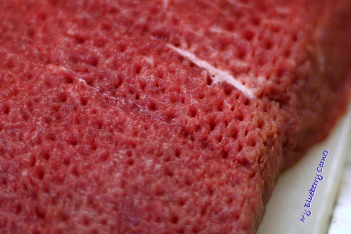Trzeba nacinać raz przy razie, bardzo gęsto. Nie żałować razów… Gdy mięso zauważalnie rozpłaszczy się i „rozejdzie” obrócić na drugą stronę i tak samo nacinać raz przy razie zawsze trzymając maszynkę prostopadle do włókien rostbefu. Dużo nakłuwania ale warto!