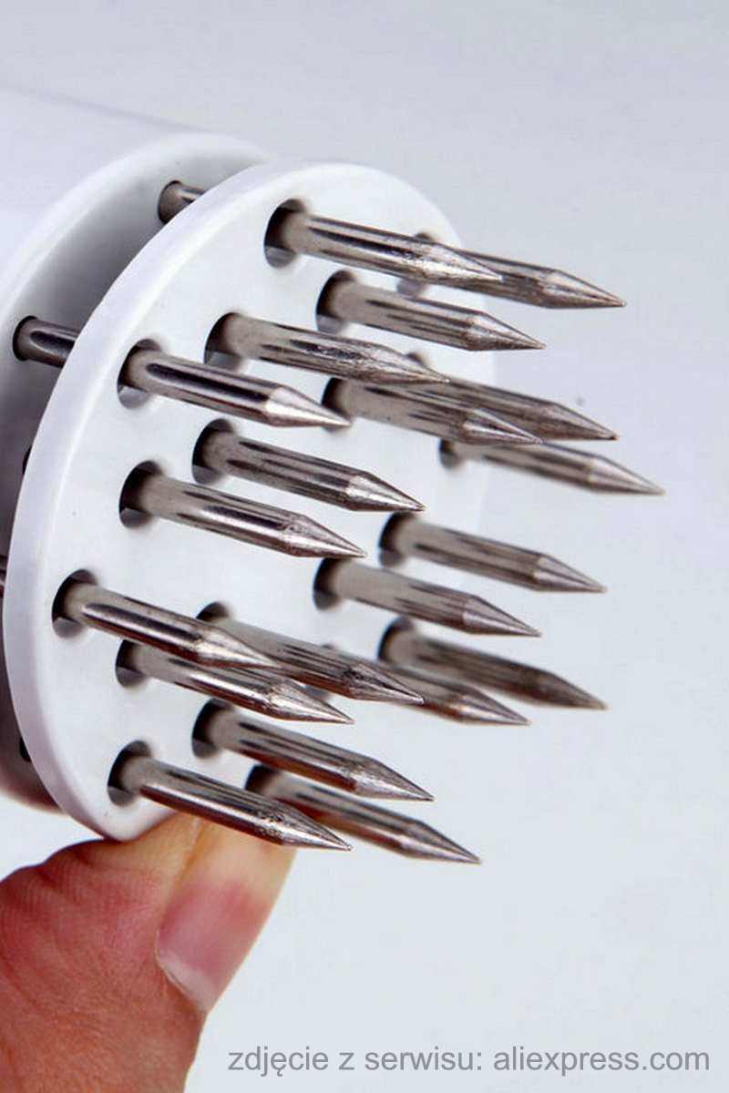 Uwaga! Maszynki do zmiękczania należy użyć zanim pokroimy mięso. Zmiękczenie maszynką polega na bardzo gęstym poprzecinaniu włókien mięśniowych, dlatego maszynka musi mieć ostrza tnące. Maszynki z okrągłymi szpikulcami nie nadają się! One tylko rozchylają włókna i umożliwiają głębszą penetrację przypraw – nie „zmiękczają” mięsa. Na zdjęciach poniżej porównanie obydwu typów:
