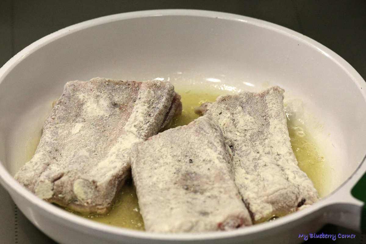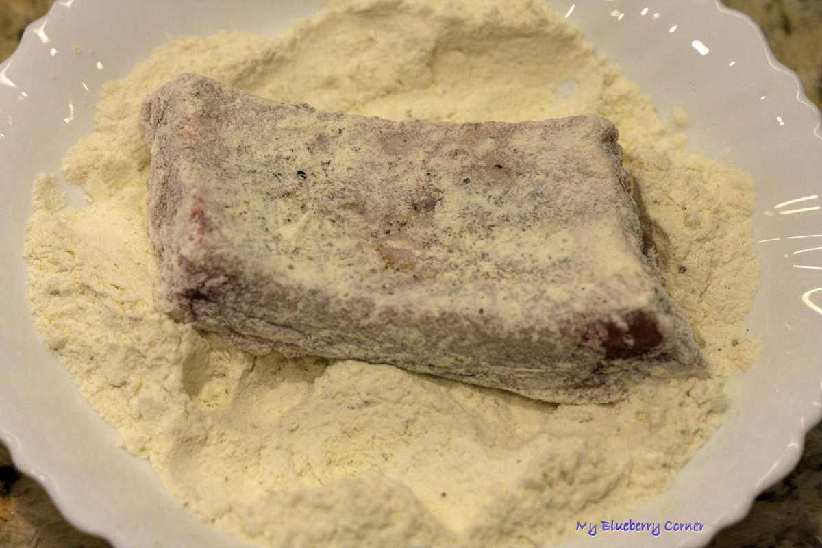 W średnim garnku zagotować wodę z liśćmi laurowymi i ziarenkami ziela angielskiego. Mięso przyprawić solą i pieprzem i obtoczyć całe w mące.